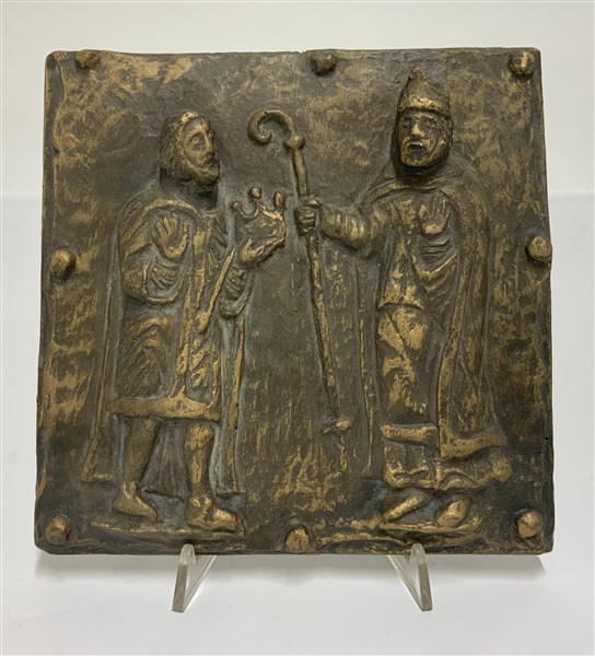 Altorilievo in ceramica dorata raffigurante santi (cm 24x24) (difetti)