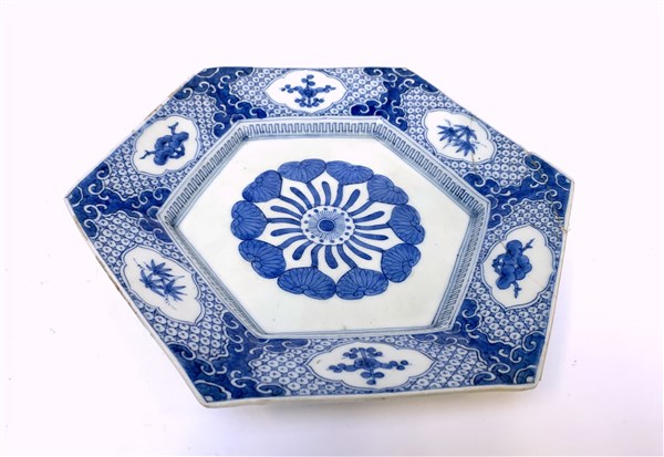 Piatto esagonale in porcellana bianca e blu decorato a motivi floreali (d. cm 22,5) (difetti rotture e restauri)