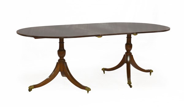 Tavolo da pranzo di forma ovale con fasce sagomate, gambe a colonna tornite poggiante su piedi sagomati muniti di rotelle e scarpette. Inghilterra secolo XIX, munito di una prolunga (cm 160x77x112) (lievi difetti)