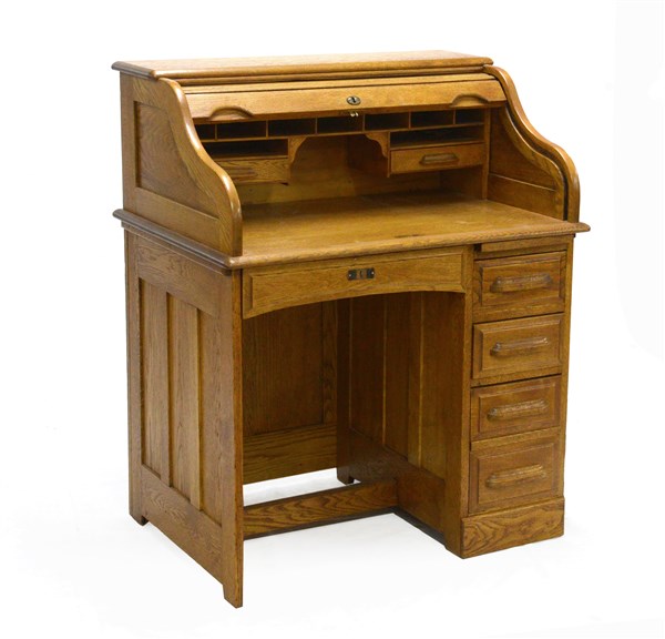 Scrittoio a rullo a quattro cassetti sottopiano e anta celante vani e cassettini (cm 88x110x70) (lievi difetti)