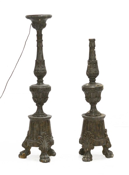 Coppia di candelieri in legno laccato e scolpito a volute e motivi geometrici con piedi leonini. Secolo XIX (h. cm 118 circa) (difetti e mancanze)