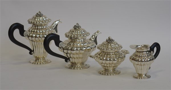 Servizio da tè e caffè in argento a corpo costolato composto da teiera, caffettiera, zuccheriera con coperchio e lattiera. Prese dei coperchi cesellate a frutta e anse in legno ebanizzato (g lordi 2650 ca.)