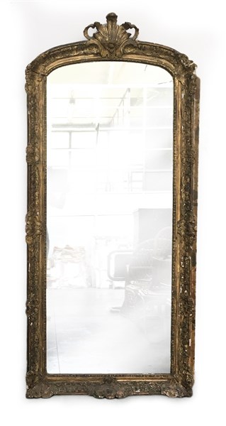 Specchiera in legno intagliato e pastiglia dorata a motivi vegetali e riccioli. Cimasa traforata a fiore e volute. Secolo XIX (cm h. cm 195) (difetti e restauri)