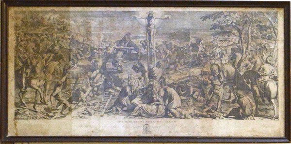 Da Tintoretto "Crocifissione" incisione del secolo XVIII (cm 66x126) In cornice (difetti)