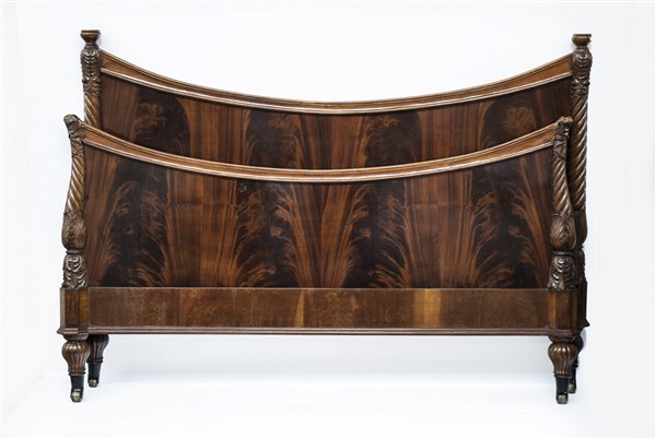 Letto a una piazza e mezza con testata e pediera lastronati in mogano. Montanti scolpiti a colonna scanalata ed intagliata a volute vegetali. Sec. XIX (difetti)