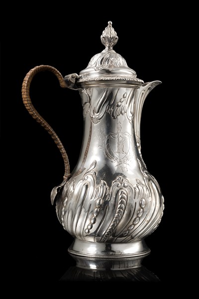 Caffettiera in argento a corpo piriforme parzialmente sbalzato a volute fogliate e perlinature, centrato da stemma. Ansa mossa rivestita in vimini, presa a guisa di pigna a tutto tondo. Londra, 1768. Argentiere L. H. (h. cm 25) (g lordi 730 ca.) (difetti)