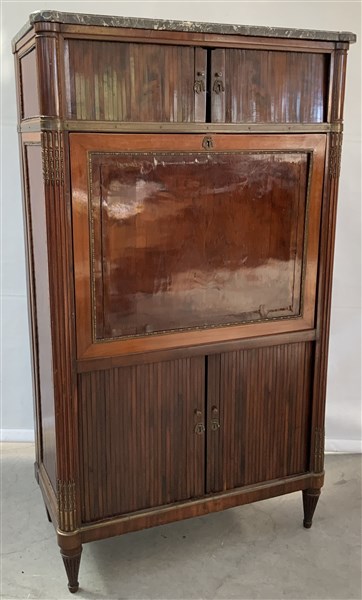 Secretaire lastronato a due ante a saracinesca e anta ribaltabile celante vani e cassettini. Montanti scanalati decorati da fregi in metallo. Piano in marmo. Francia, secolo XIX (cm 90x156x44) (difetti)