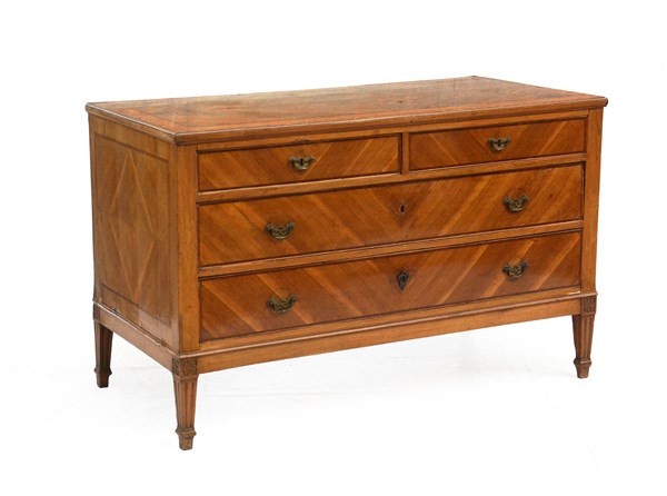 Cassettone lastronato e filettato in legni vari a due cassetti e due mezzi cassetti sotto piano. Gambe scanalate e intagliate all'attacco. Veneto, secolo XVIII (cm 140x88x68) (difetti e restauri)