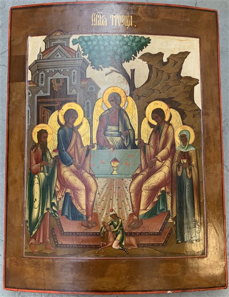 Lot 203 | Icona ad olio su tavola raffigurante la Trinità. Russia, fine secolo XIX (cm 54