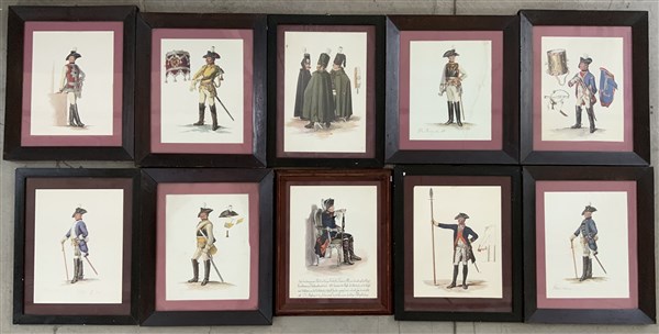 Lotto di dieci incisioni acquerellate, figurini militari dell'esercito prussiano sotto Federico II compreso il suo ritratto assiso. (cm45x38) (difetti)