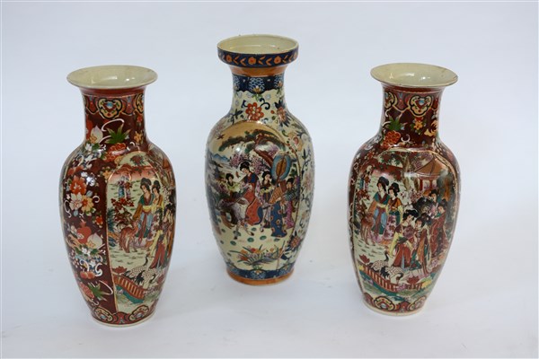 Lotto di tre vasi in ceramica cinese in stile Satsuma, secolo XX (h max cm 31) (difetti)