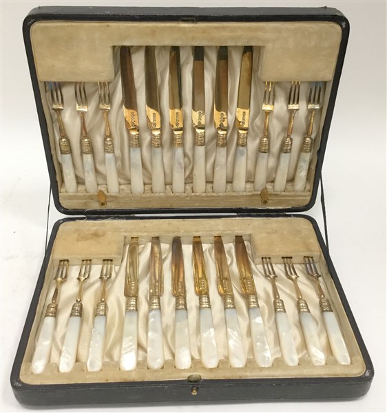 Servizio da dolce composto da dodici forchette e dodici coltelli in argento dorato e madreperla, punzone inglese, in custodia originale (lievi difetti)