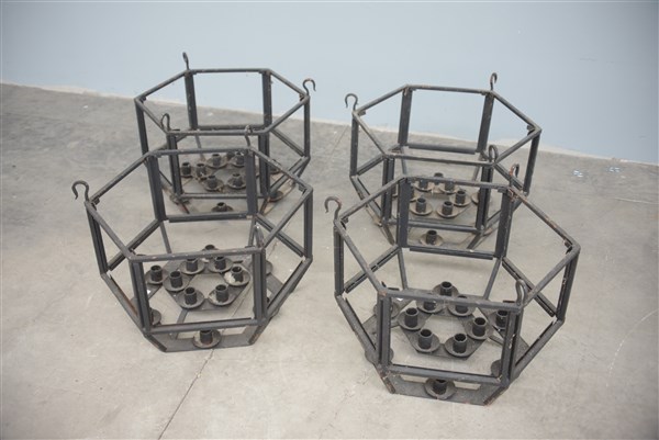 Gruppo di quattro lanterne da esterno in ferro battuto a dodici luci (difetti)