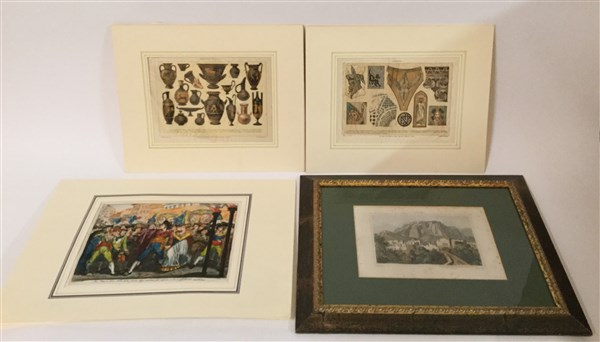 Lotto composto da quattro stampe del XIX secolo: una raffigurante uno scorcio di Capri, una di Bartolomeo Pinelli raffigurante una scena con Meo Patacca, una raffigurante antico vasellame greco e una raffigurante mosaici. Misure diverse