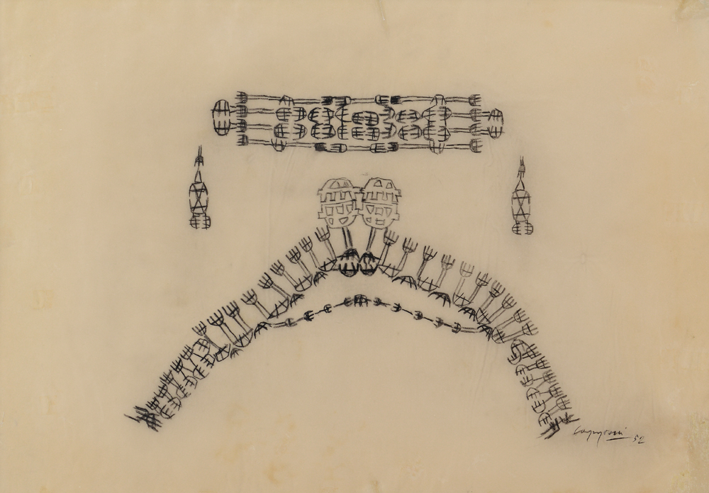 GIUSEPPE CAPOGROSSI Roma 07/03/1900 - Roma 09/10/1972 Collana, bracciale e pendenti (studio per gioielli), 1952 matita grassa su carta cm. 42,5x61,8; firma e anno in basso a destra, etichetta e timbro della Galleria Arte Centro (MI) al retro, opera registrata al numero AC/269/D presso l'Archivio della Fondazione Capogrossi come da dichiarazione su foto.