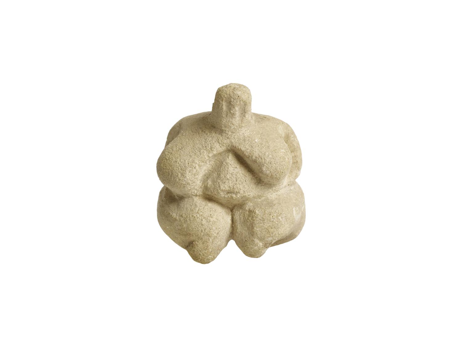 Statuetta di dea madre steatopigia seduta con testa cilindrica senza indicazione del volto, braccia portate in avanti a sostenere i grandi seni, ampio ventre prominente, gambe corte e tozze, natiche in evidenza