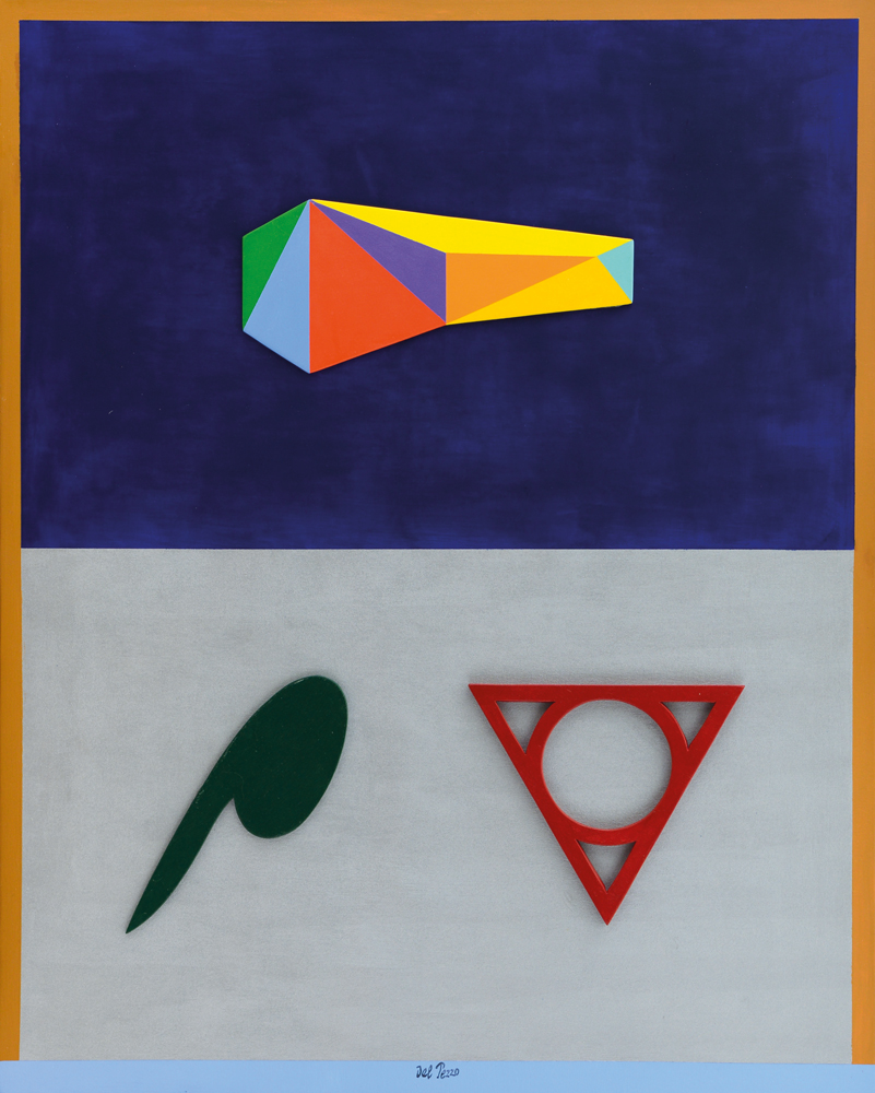 LUCIO DEL PEZZO Napoli 1933 Oggetto collage, colore acrilico su legno cm. 75x60, firma in basso al centro, titolo, firma e tecnica al retro, dichiarazione d'autenticità dell'artista e Archivio Lucio Del Pezzo a cura della Galleria Vinciana (MI) su foto.