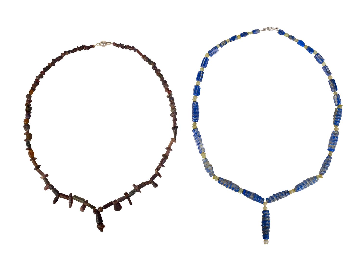 Collana costituita da elementi tubulari scanalati e prismatici in lapislazzuli, alternati a vaghi in quarzo; collana con vaghi cilindrici e sferici in pasta vitrea color ambra (2)