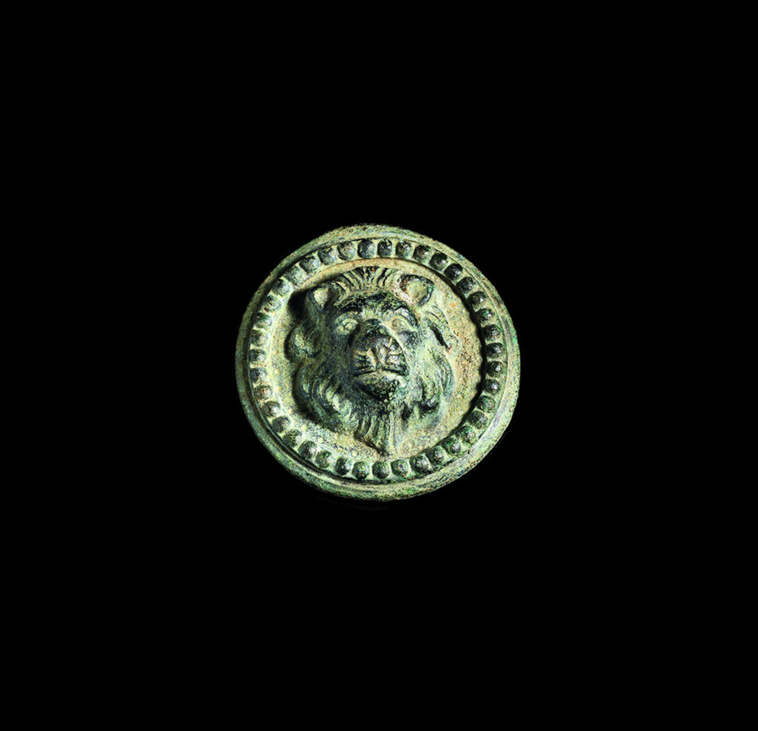 Applique di forma circolare con bordo perlinato, al centro in altorilievo, una protome di leone, accuratamente modellata, con orecchie tondeggianti, folta criniera a lunghi ciuffi, muso prominente con indicazione dei baffi e delle fauci; pur nelle piccole dimensioni l'artista rende con estrema accuratezza le fattezze dell'animale.
