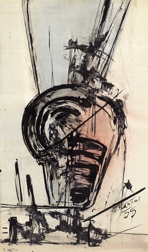 GIANNI BERTINI Pisa 31/07/1922 - Caen (Normandia) 08/07/2010 Senza titolo, 1955 tecnica mista su cartoncino cm. 72x42, firma e anno in basso a destra, firma in basso a sinistra, firma e anno al retro, dichiarazione d'autenticità del figlio Thierry su foto.