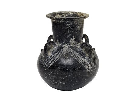 Olletta dal corpo globulare, alto collo cilindrico con orlo estroflesso e appiattito; sulla spalla, quattro anse impostate verticalmente. Superficie scura brunita e decorata a fasci di linee parallele che si intersecano, nei punti di incrocio piccole apofisi coniche