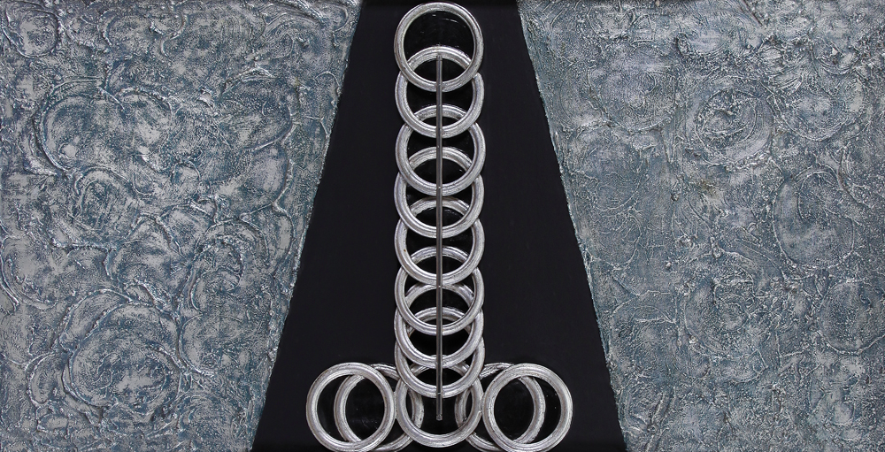 ELIO MARCHEGIANI Siracusa 02/09/1929 Cerchi dinamici, 1963 tecnica mista e applicazioni in metallo su tela cm. 60x120, firme e titolo al retro, particolare pubblicato a piena pagina su Elio Marchegiani linee di produzione 1957-2007, Edizioni Carte Segrete, pagina 357.