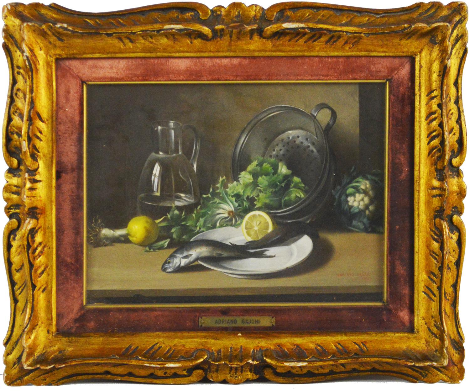 Adriano Gajoni NATURA MORTA CON PESCE olio su tavoletta, cm 20x27 firma e...