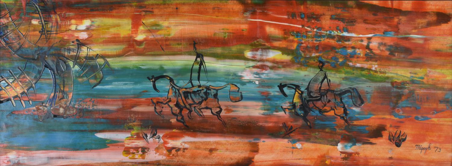Mipoph DON CHISCIOTTE olio su tavola, cm 65x25 firma e data eseguito nel 1973