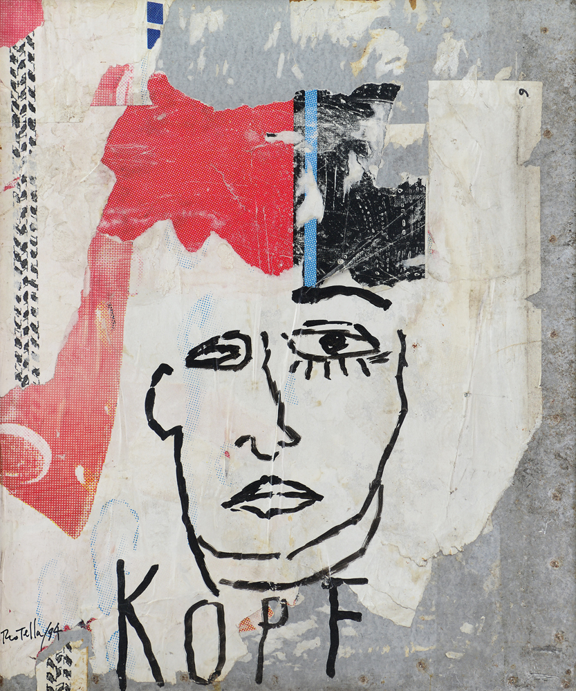 MIMMO ROTELLA Catanzaro 07/10/1918 - Milano 08/01/2006  Kopf, 1994 sovrapittura su decollage su lamiera cm. 60x50, firma e anno in basso a sinistra, firma, titolo e timbro della Galleria Franco Cancelliere al retro, dichiarazione d'autenticità dell'artista e timbri della Galleria Franco Cancelliere su foto, pubblicato sul catalogo della mostra "Mimmo Rotella, Respect", a cura di Lucio Barbera, Adriano Parise Editore, tenutasi nell'aprile-maggio 2000 presso la Galleria Franco Cancelliere (ME).