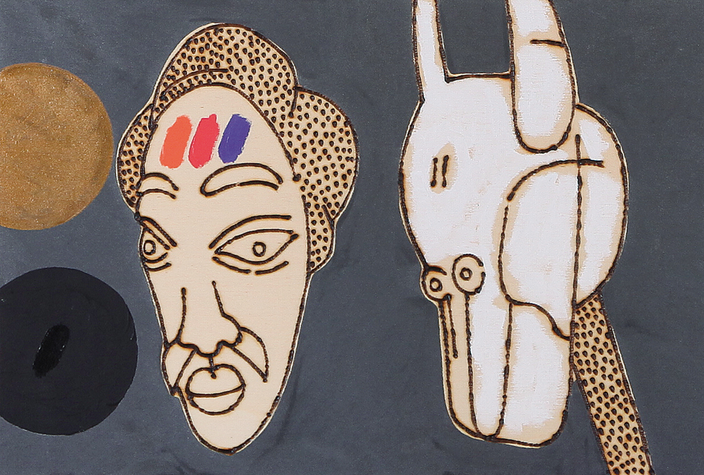 CONCETTO POZZATI Vo' Vecchio (Pd) 01/12/1935 Imagologia, 2001 tecnica mista su tavola pirografata cm. 20x30, firma, titolo, anno e timbro della Galleria Giraldi al retro.