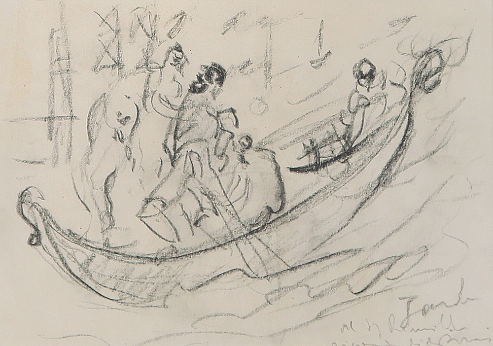 FILIPPO DE PISIS Ferrara 11/05/1896 - Milano 02/04/1956 Gondola con personaggi (paesaggio di Venezia), 1932 ca matita su carta cm. 17,7x25,4; dedica in basso a destra che cita: al Sig. Rimoldi ricordo di De Pisis, dichiarazione d'autenticità del Prof. Luigi Cavallo su foto, il presente disegno proviene dalla raccolta Rimoldi di Cortina D'Ampezzo, dichiarazione d'acquisto della Brerarte (MI) del 21/11/1972 allegata.