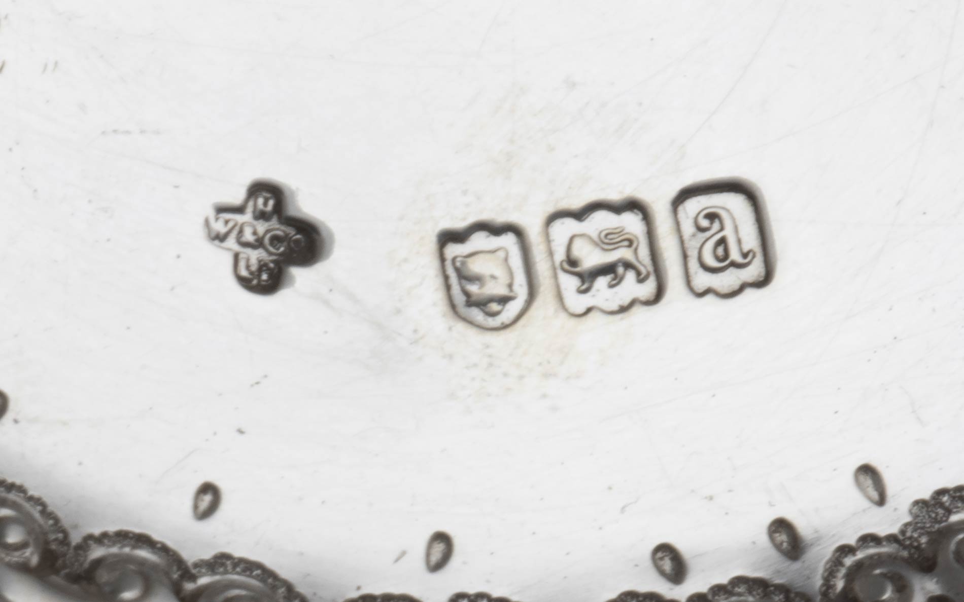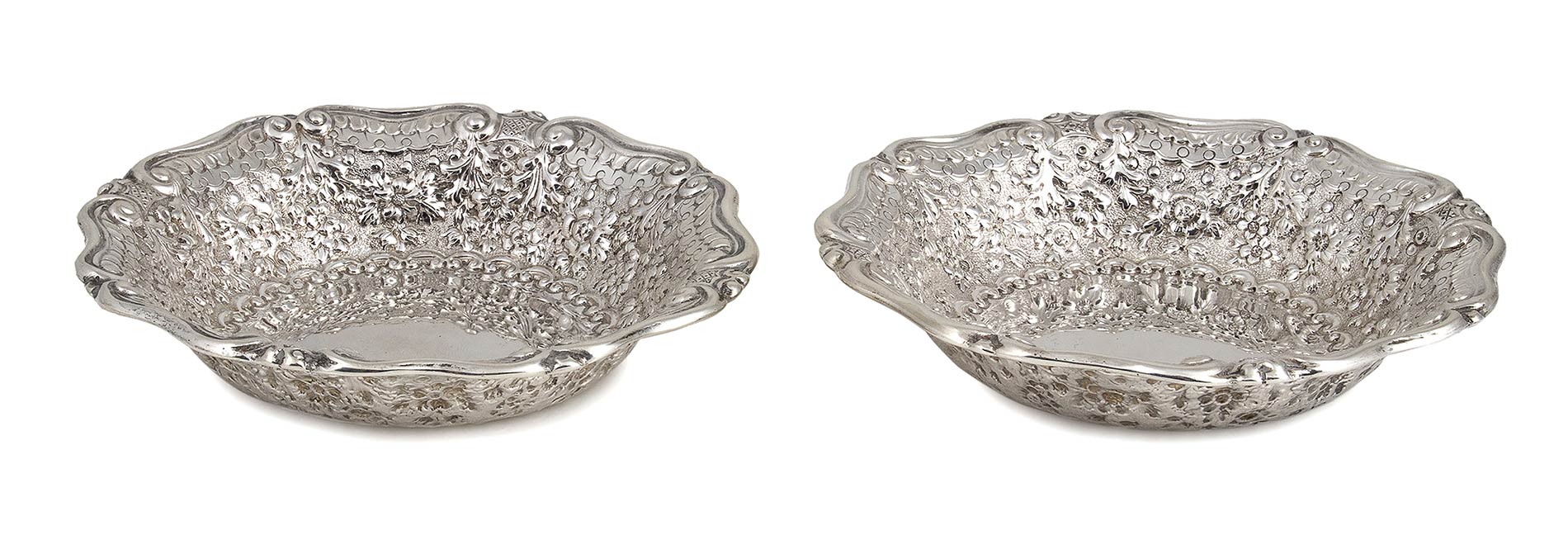 di forma rotonda sbalzate e cesellate con decori floreali. Serie completa di marchi per Londra 1895-97, argentieri Horace Woodward & Co. Ltd. Diametro 13 cm, altezza 2,5 cm. Peso 180 gr. Stato di conservazione: ***** eccellente.