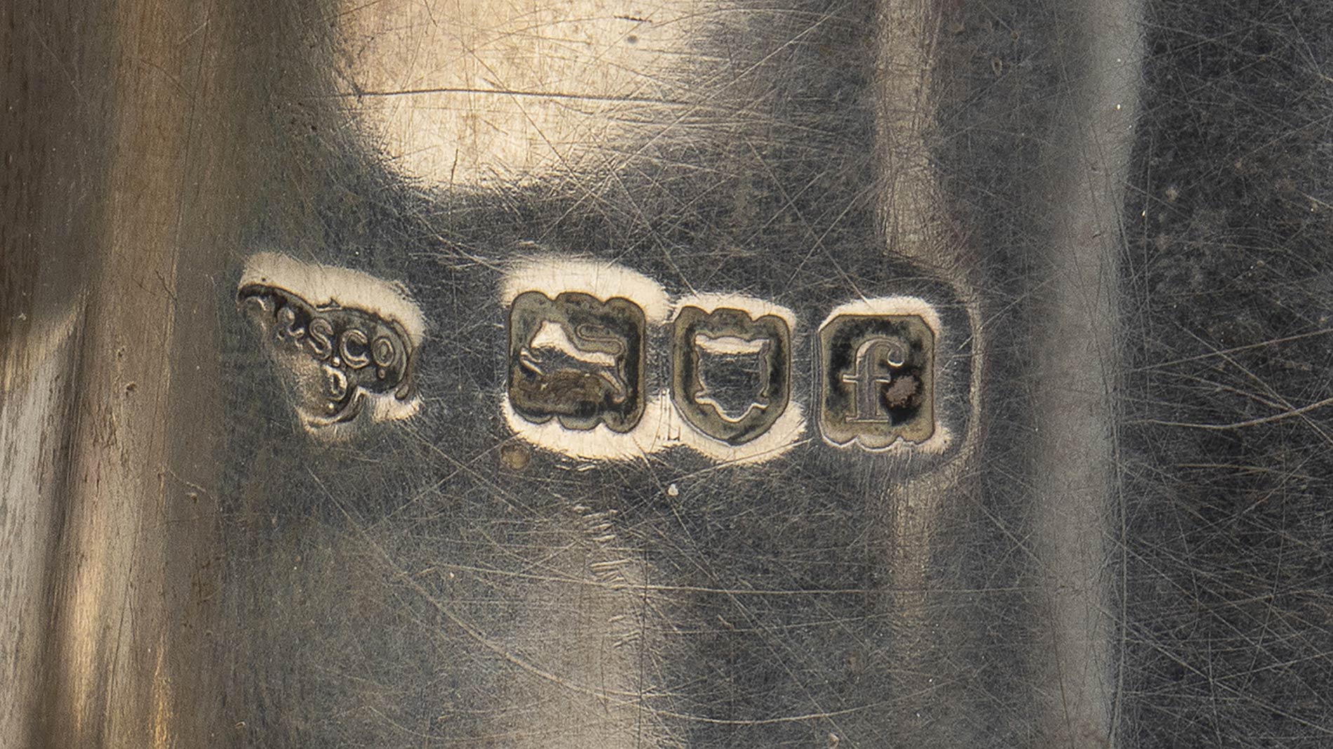 corpo in vetro con base tonda, montatura superiore in argento, presa liscia con terminale a voluta. Serie compleata di marchi Londra 1901-02, Goldsmiths & Silversmiths Co. Ltd. Altezza 23 cm. Peso 1020 gr. Stato di conservazione: **** buono.