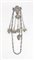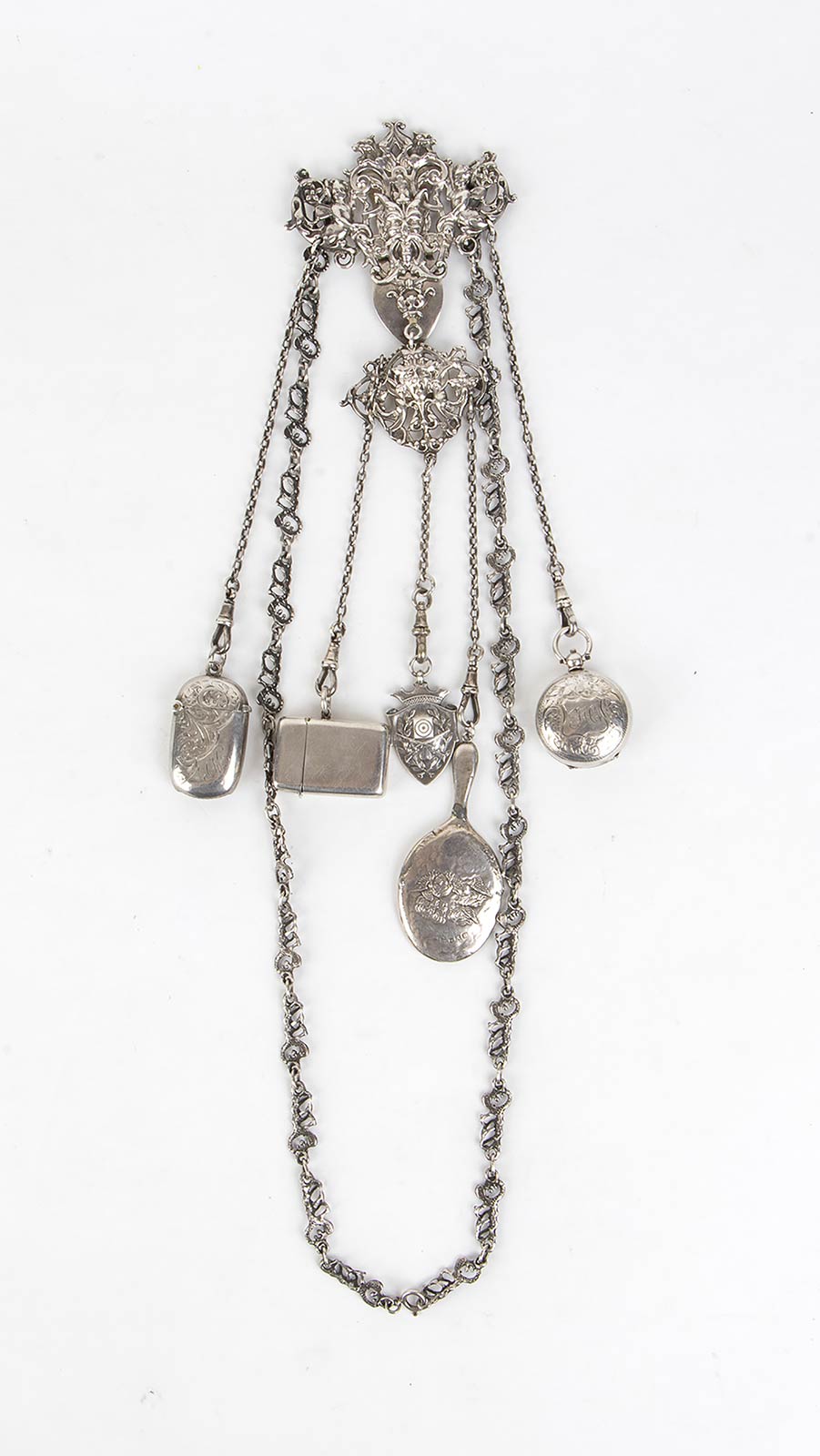 Una chatelaine è un ornamento decorativo con gancio o fibbia per cintura indossata in vita con una serie di catene sospese ad essa. Questa chatelaine è provvista di uno specchio, un portafiammiferi, un contenitore per sterline, una medaglia e una scatolina "Shotgun".