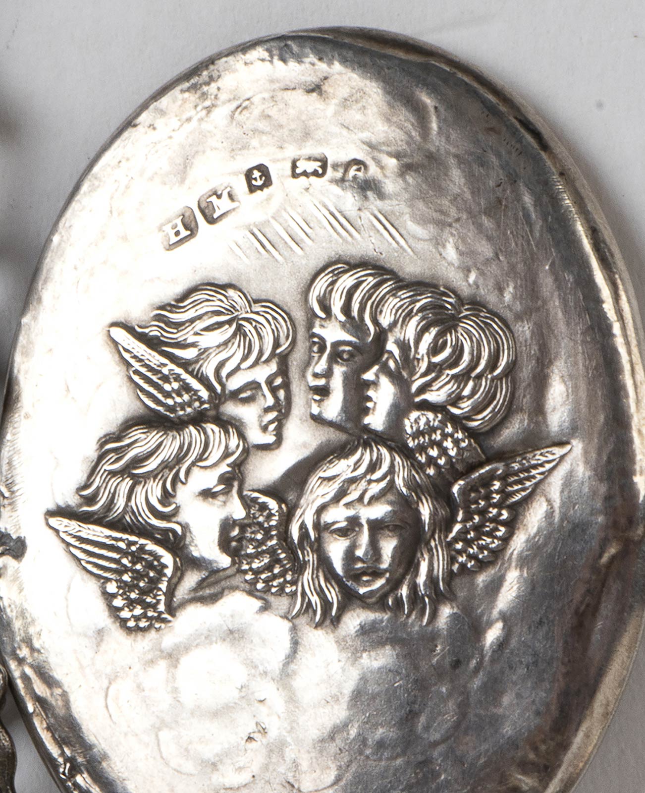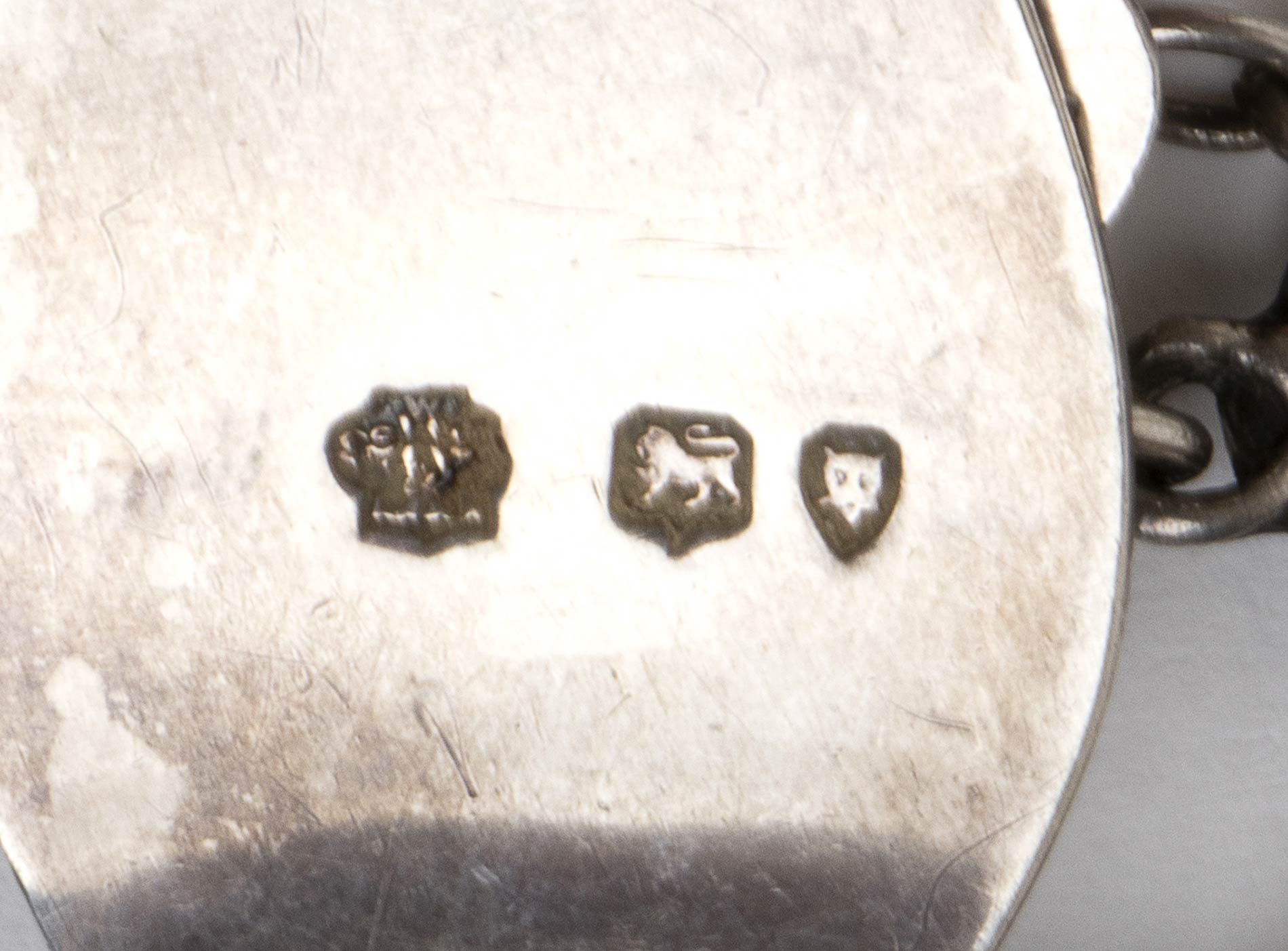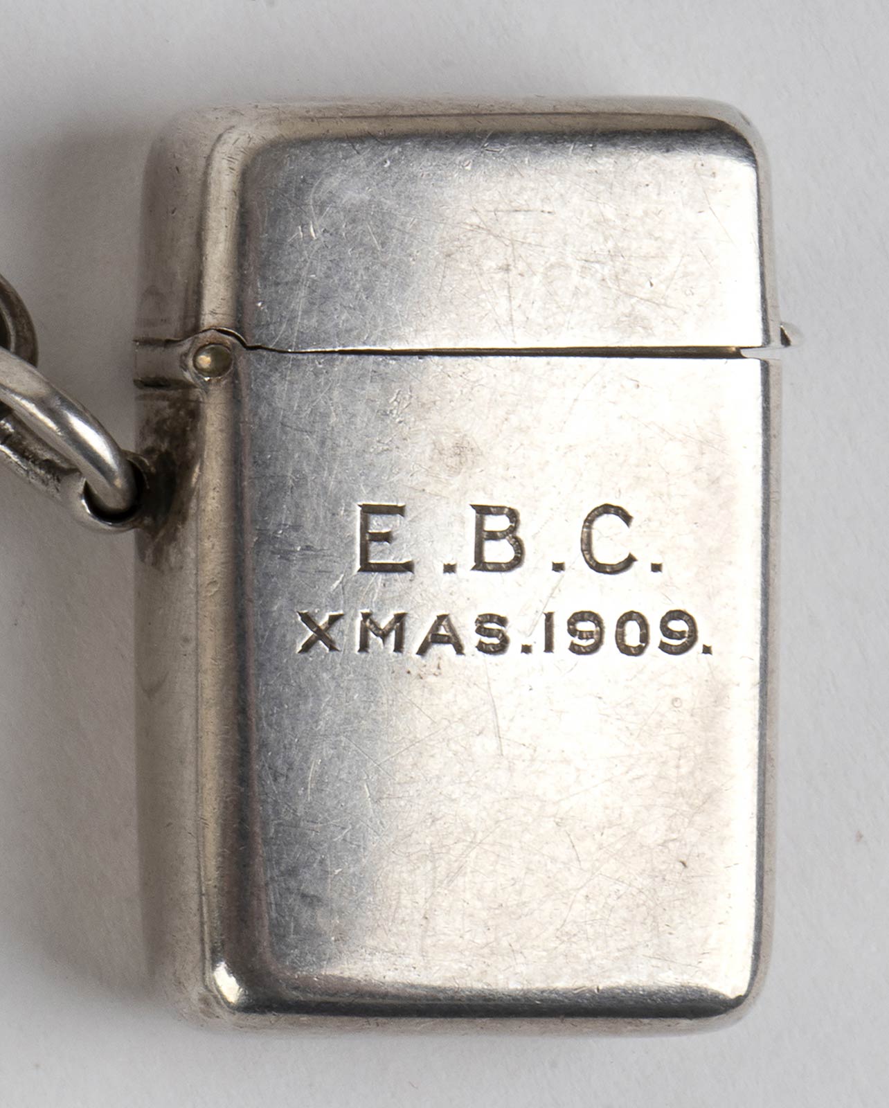 La chatelaine è punzonata con la serie completa di marchi di Londra 1892-1893, argentieri William Hutton & Sons Ltd; lo specchio è punzonato con la serie completa di marchi di Birmingham 1904-1905, argentiere Henry Matthews; il portafiammiferi è punzonato con la serie completa di marchi di Birmingham 1910-1911, argentieri Smith & Bartlam; il contenitore per sterline è punzonato con la serie completa di marchi di Birmingham 1914-1915, argentiere F H Adams Ltd; la medaglia e punzonata "solid silver" e la scatolina "Shotgun" non è punzonata ma presenta incisa l'iscrizione E.B.C. XMAS.1909 e contiene 8 pioli numerati in avorio. Lo "Shotgun finder place" è un dispositivo utilizzato per scegliere la prima posizione in un gioco di tiro; la forma più comune è simile a un scatolina portafiammiferi contenente fino a 10 pioli numerati in avorio, ma sono noti esempi a forma di cartuccia o di pallone contenente palline numerate. I pioli numerati vengono inseriti casualmente nel contenitore e ogni tiratore estrae a turno un piolo per rilevando la propria posizione di tiro. Completa di catena accessoria in argento non punzonata. Peso totale 162 gr. Stato di conservazione: **** buono