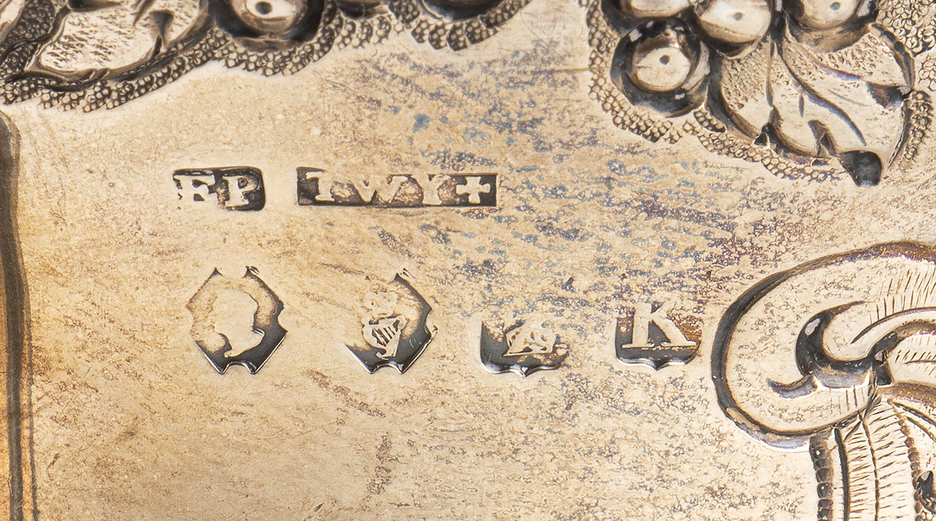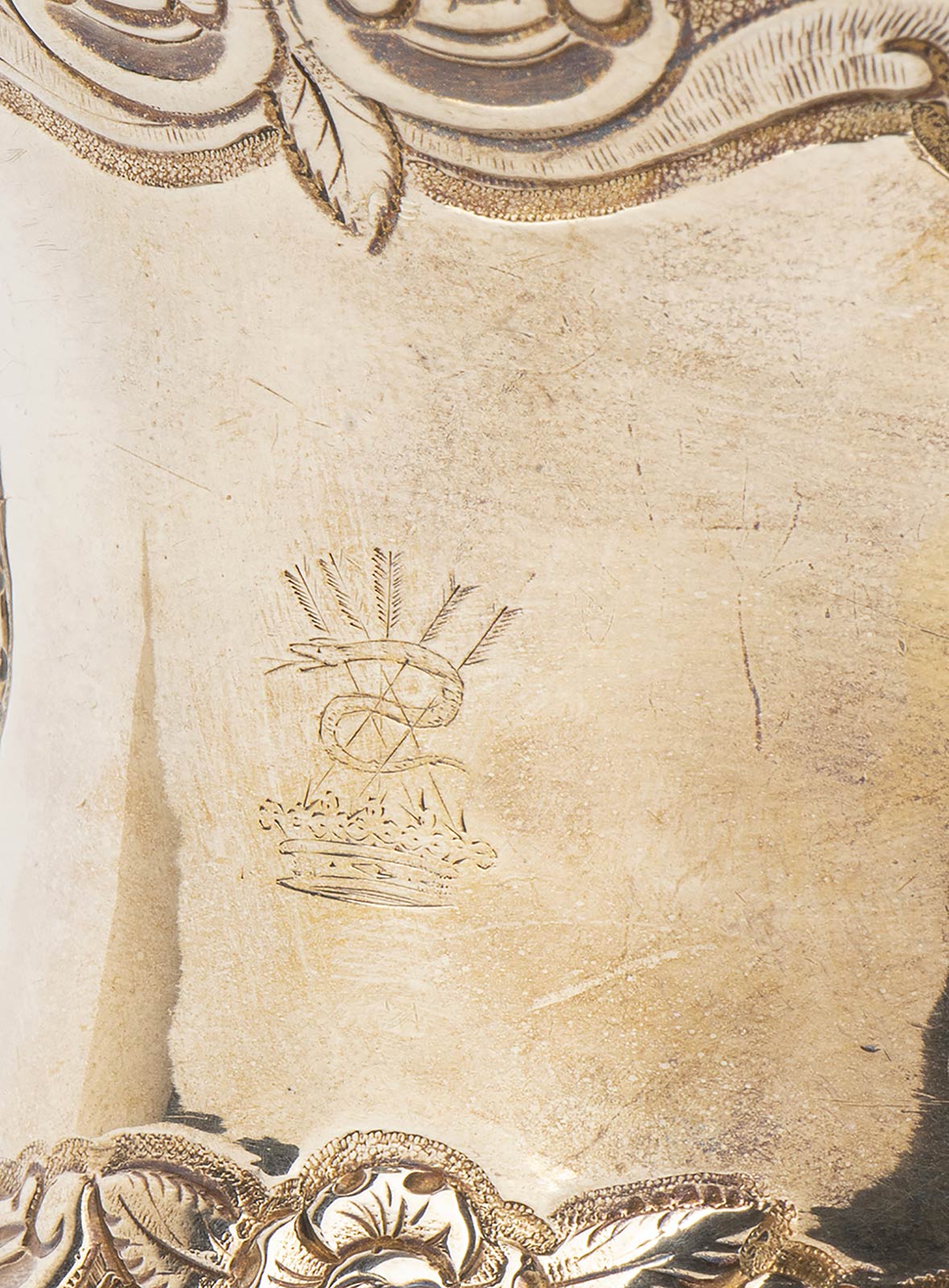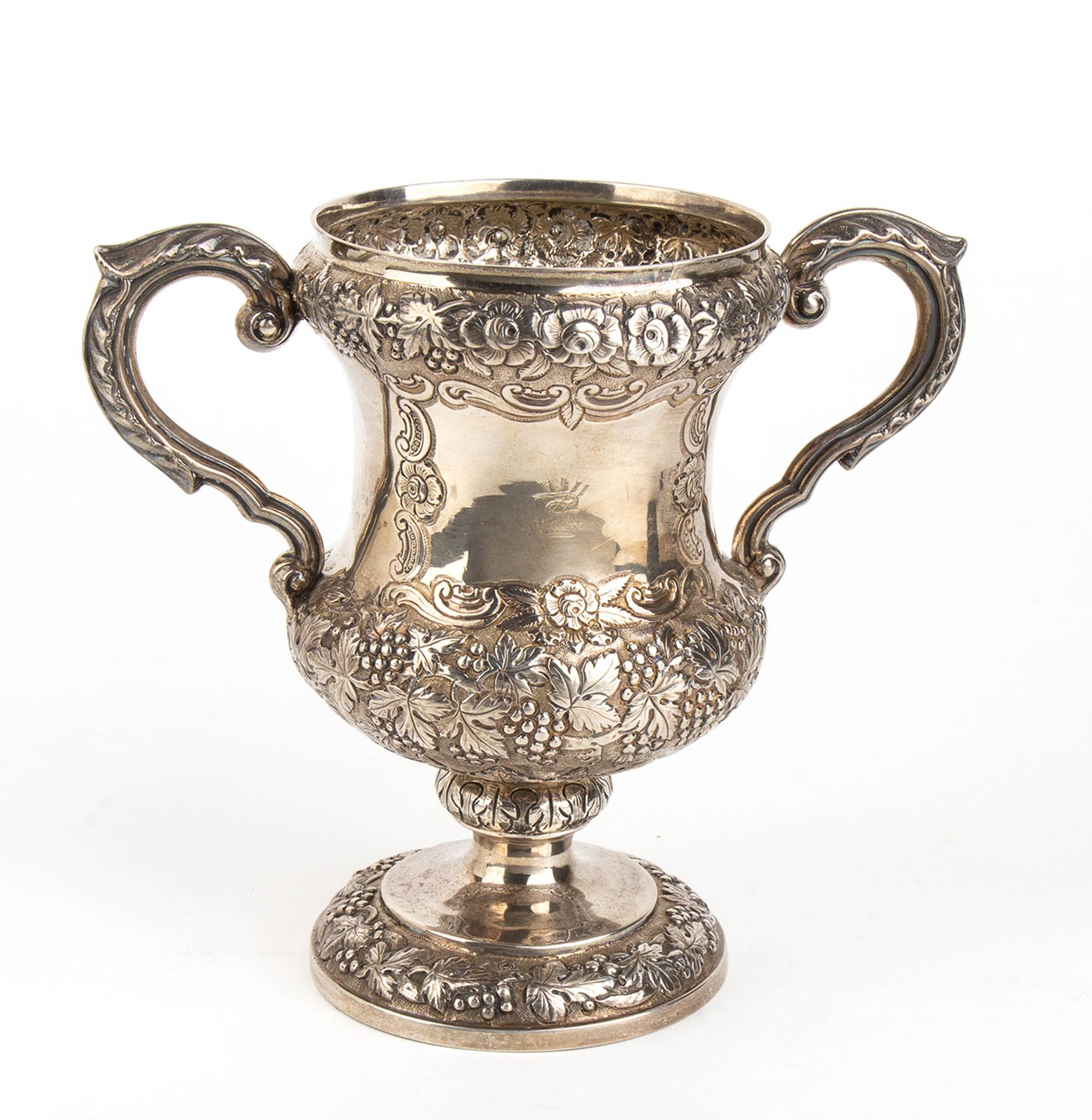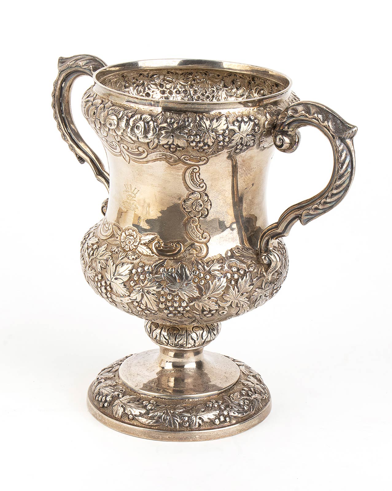 a due manici su piede circolare, il corpo completamente sbalzato con fiori, grappoli d'uva e pampini, inciso su un lato con una cresta nobiliare e sul lato opposto con un cartiglio libero. Serie completa di marchi Dublino 1830-1831, argentiere Edward Power per Edward Twycross. Edward Twycross (1803–1852) fu un argentiere, avvocato e scrittore di Dublino che nel 1847 pubblicò un libro, "Le dimore di Inghilterra e Galles", che viene usato come riferimento storico per le maestose case d'Inghilterra e per tracciare genealogie dei membri dell'aristocrazia britannica. All'inizio della sua vita, Edward lavorò come argentiere a Dublino, con il marchio "TWY +", realizzando raffinate argenterie irlandesi nel negozio al dettaglio di suo padre a Dublino: John Twycross e figlio, orafi; John Twycross era un rinomato maestro della Corporazione degli orafi-argentieri di Dublino, argentiere per sua maestà e fregiato del titolo di "The Lord Lieutenant". Edward lavorò spesso con l'argentiere Edward Power e talvolta hanno usato i due marchi abbinati. Larghezza manici inclusi 21,5 cm, altezza 18,5 cm. Peso totale 581 gr. Stato di conservazione: **** buono.