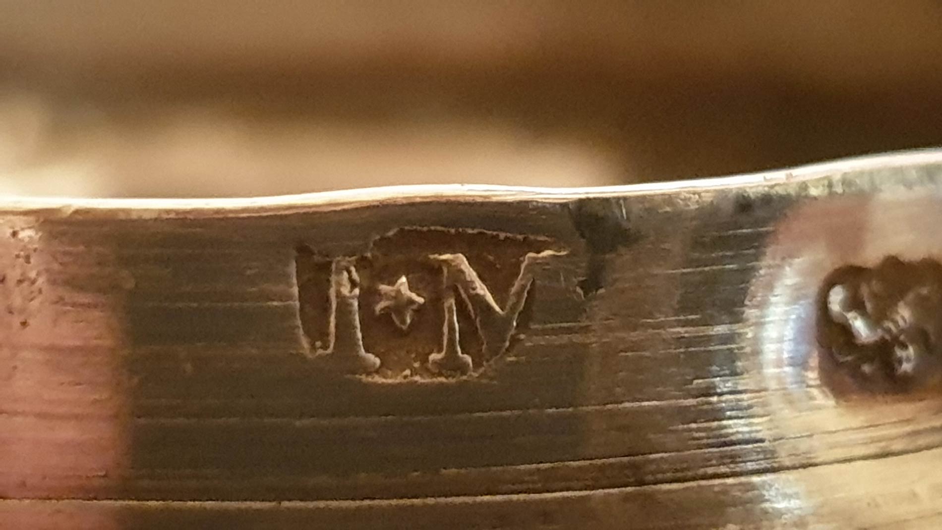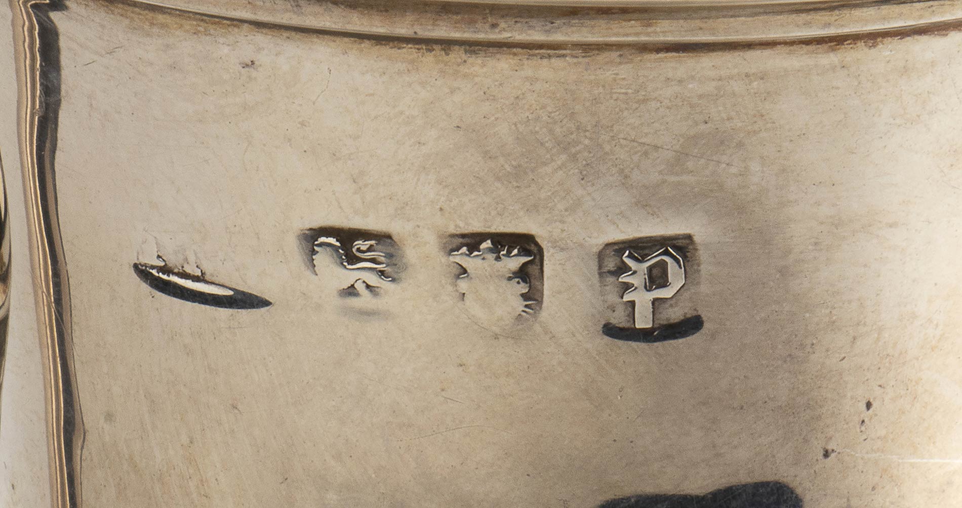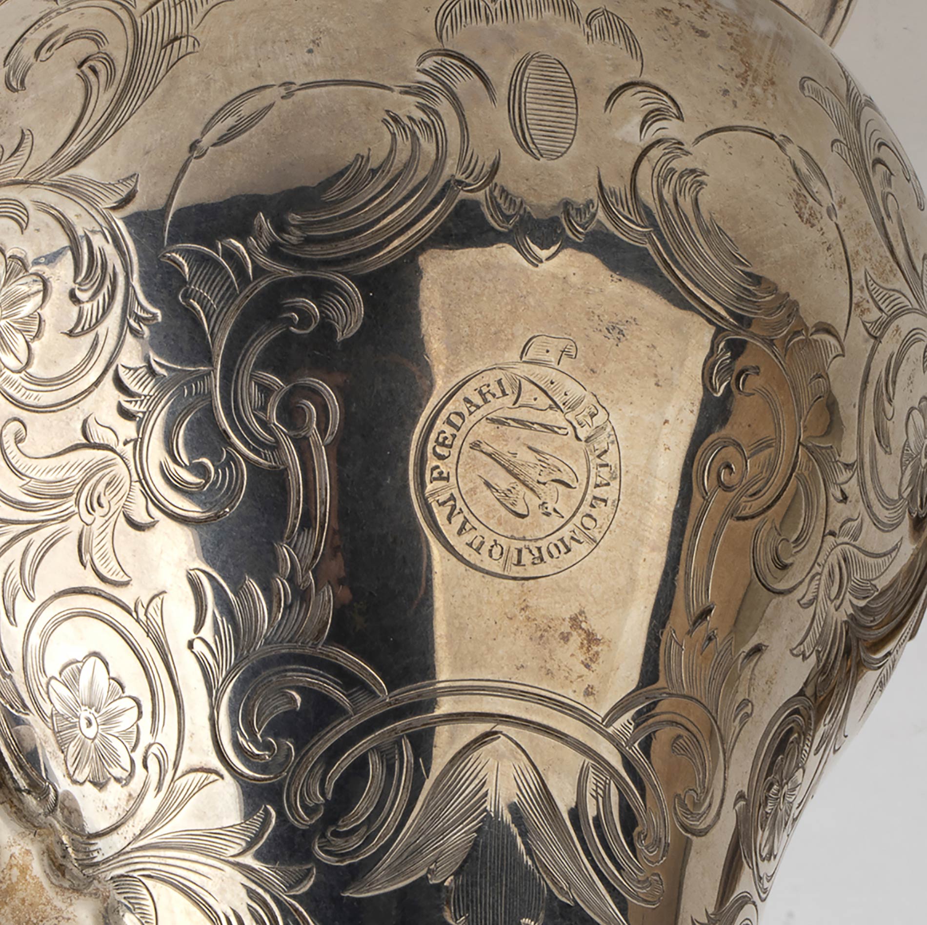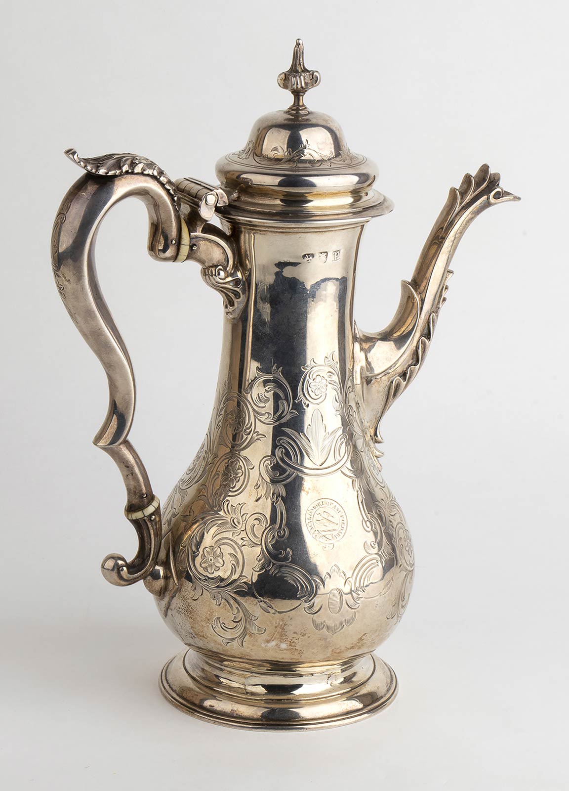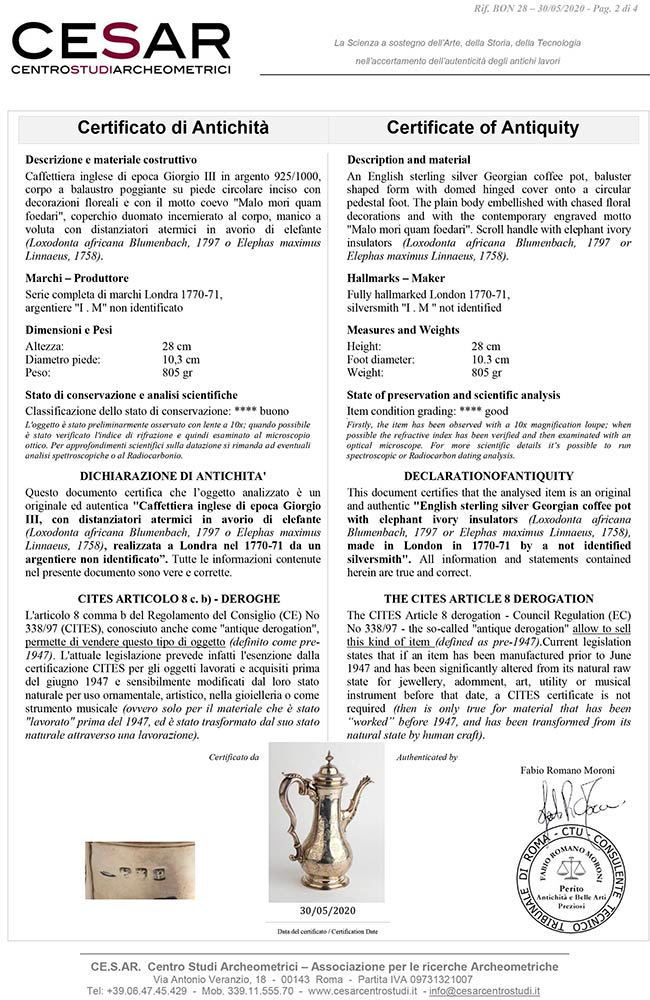 corpo a balaustro poggiante su piede circolare inciso con decorazioni floreali e con il motto "Malo mori quam foedari", coperchio duomato, manico a voluta con distanziatori atermici in avorio di elefante (Elephas maximus Linnaeus, 1758 o Loxodonta africana Blumenbach, 1797). Serie completa di marchi Londra 1770-71, argentiere "I . M" non identificato. Altezza 28 cm, diametro piede 10,3 cm. Peso 805 gr. Stato di conservazione: **** buono. Certificato di Antichità Ce.S.Ar. (pre-1947).