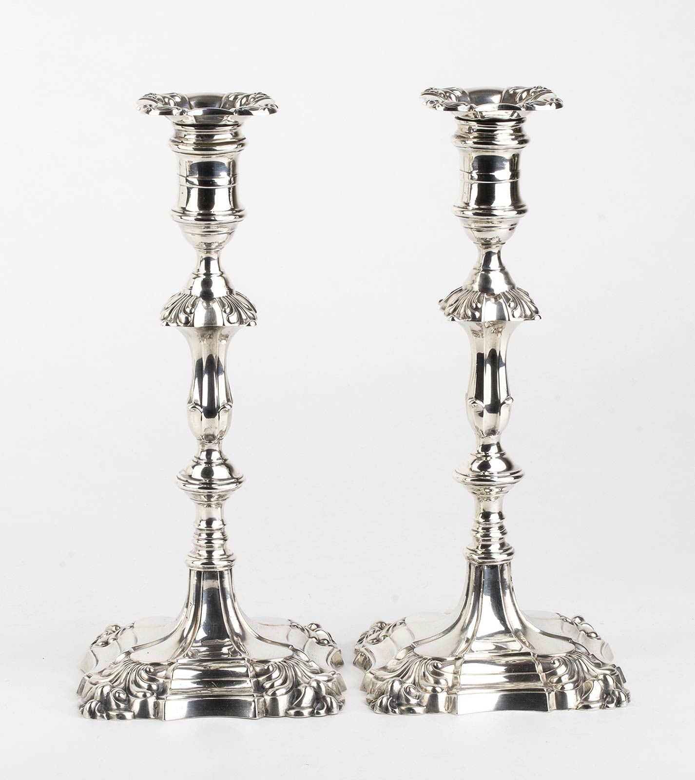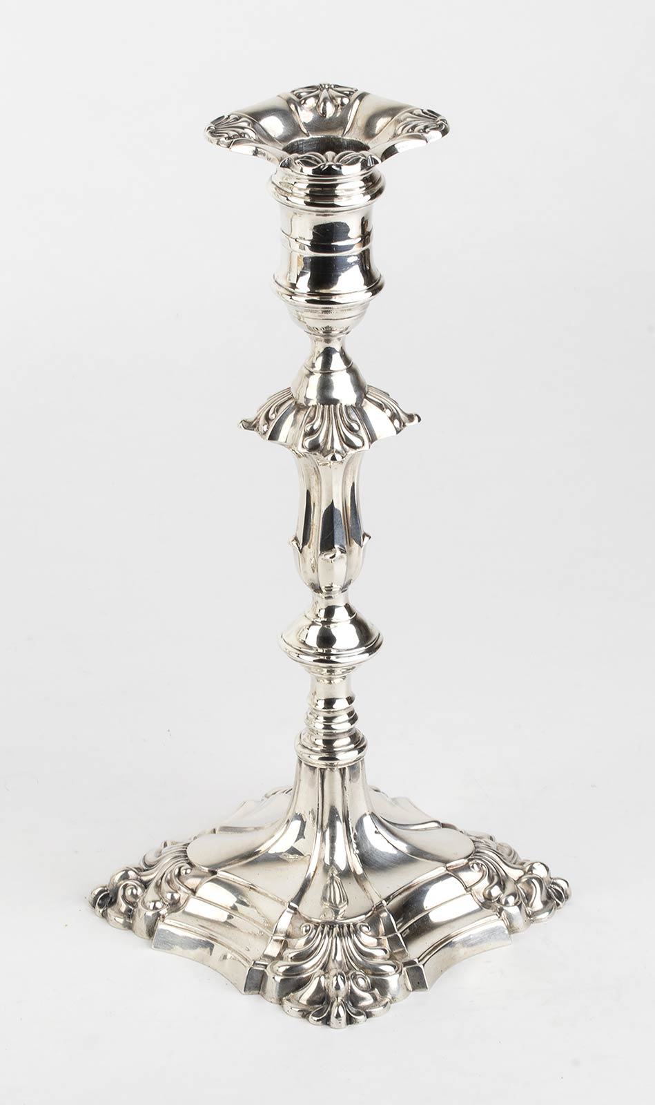 a balaustro con base decorata con quattro conchiglie stilizzate; piattini salva cera removibili. Serie completa di marchi Londra 1896-1897. Dimensioni 11 x 11 cm, altezza 24,5 cm. Peso totale 1357 gr. (appesantiti). Stato di conservazione: **** buono.