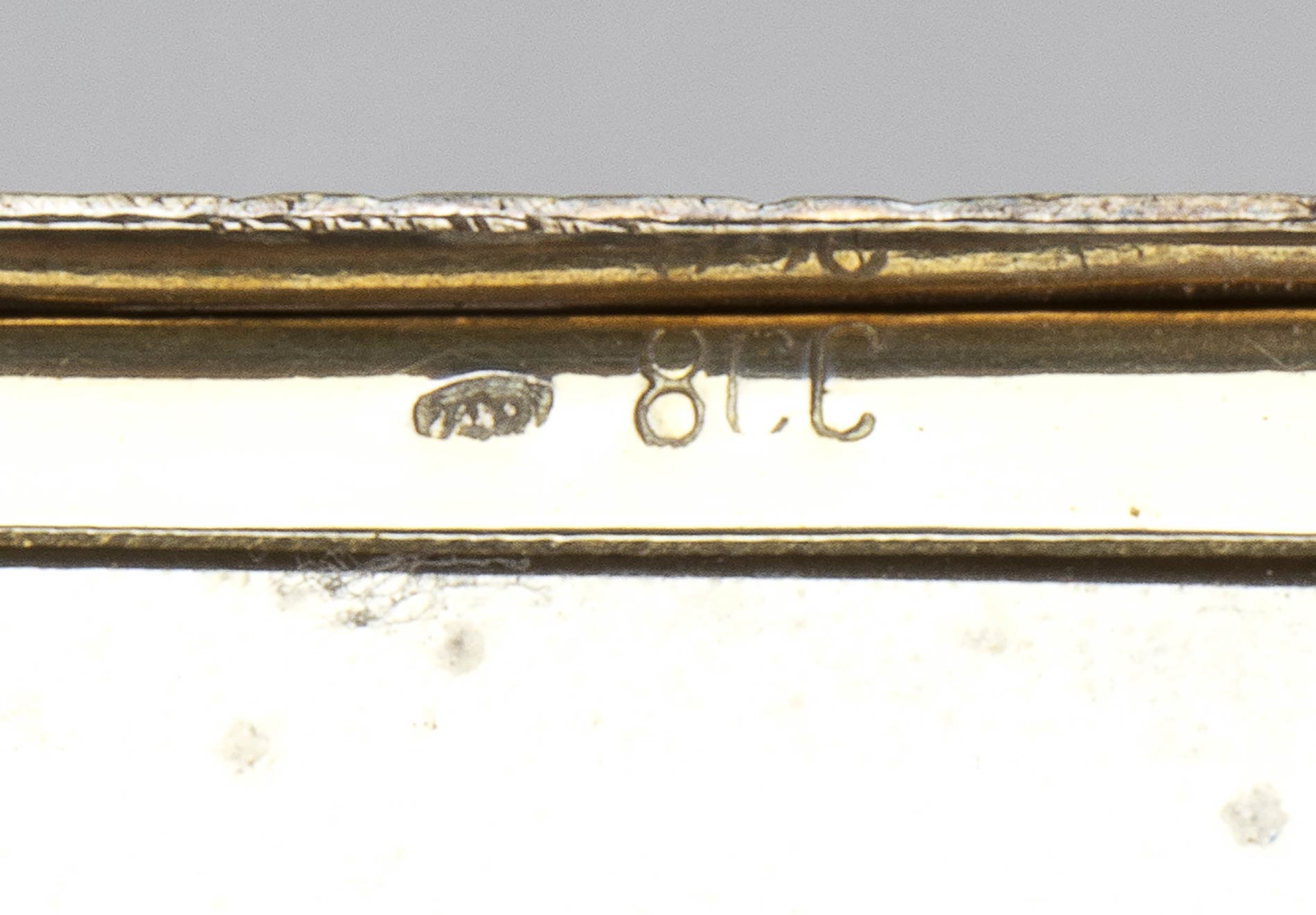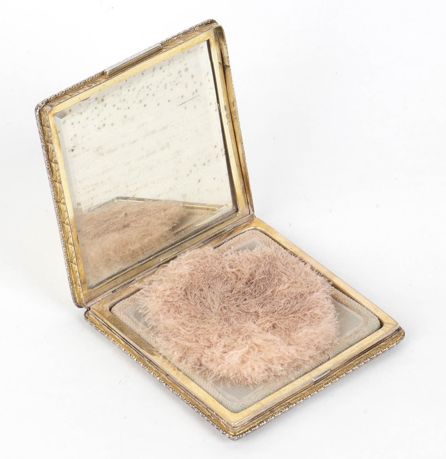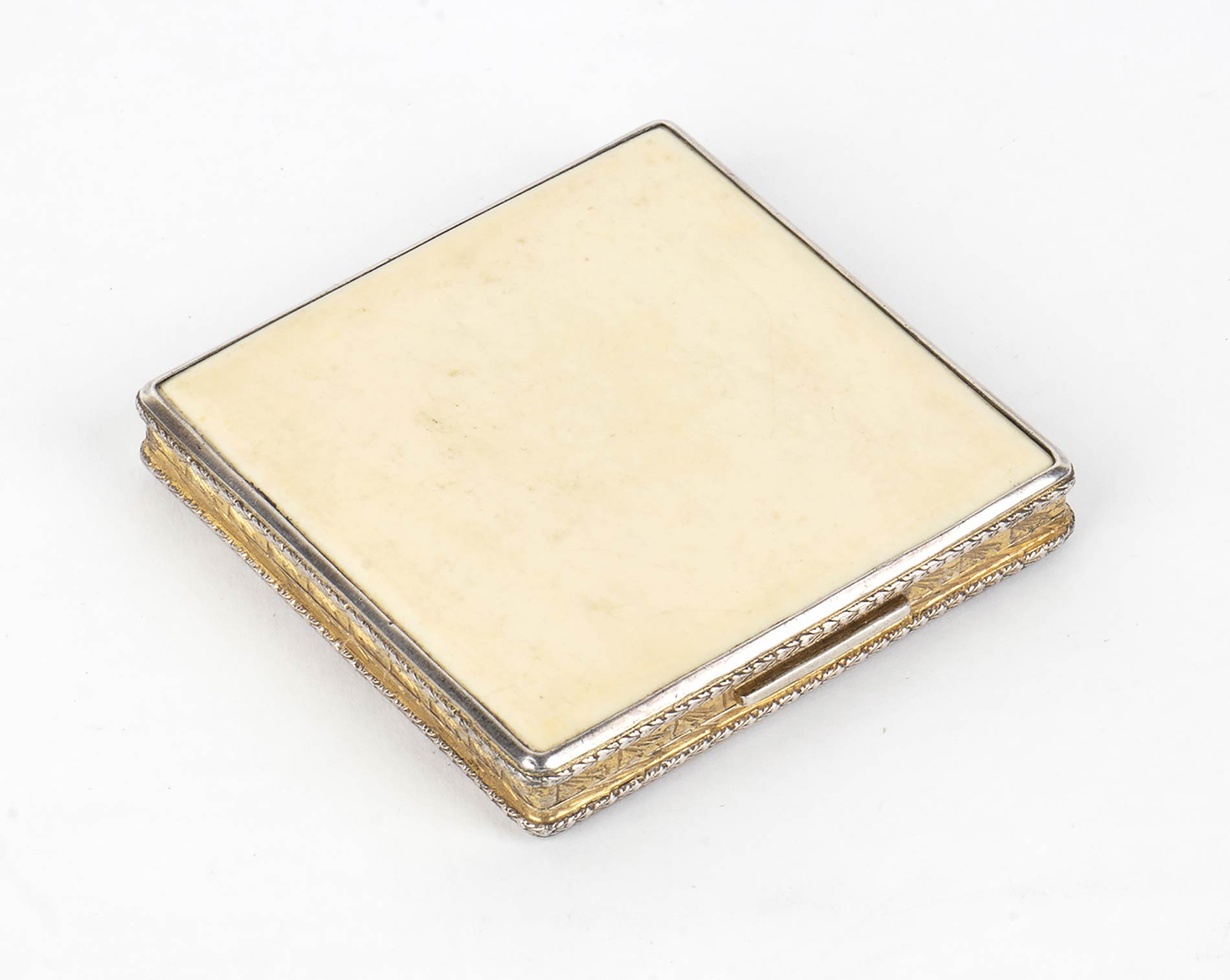 coperchio e base in avorio di elefante (Loxodonta africana Blumenbach, 1797 o Elephas maximus Linnaeus, 1758) con i quattro lati in argento dorato. Completo di retina pressacipria e piumino originali, usati ma ancora in buone condizioni. Punzonato "800". Dimensioni 7,2 x 7,2 x 1,1 cm. Peso complessivo 104 gr. Stato di conservazione: **** buono. Certificato di Antichità Ce.S.Ar. (pre-1947).
