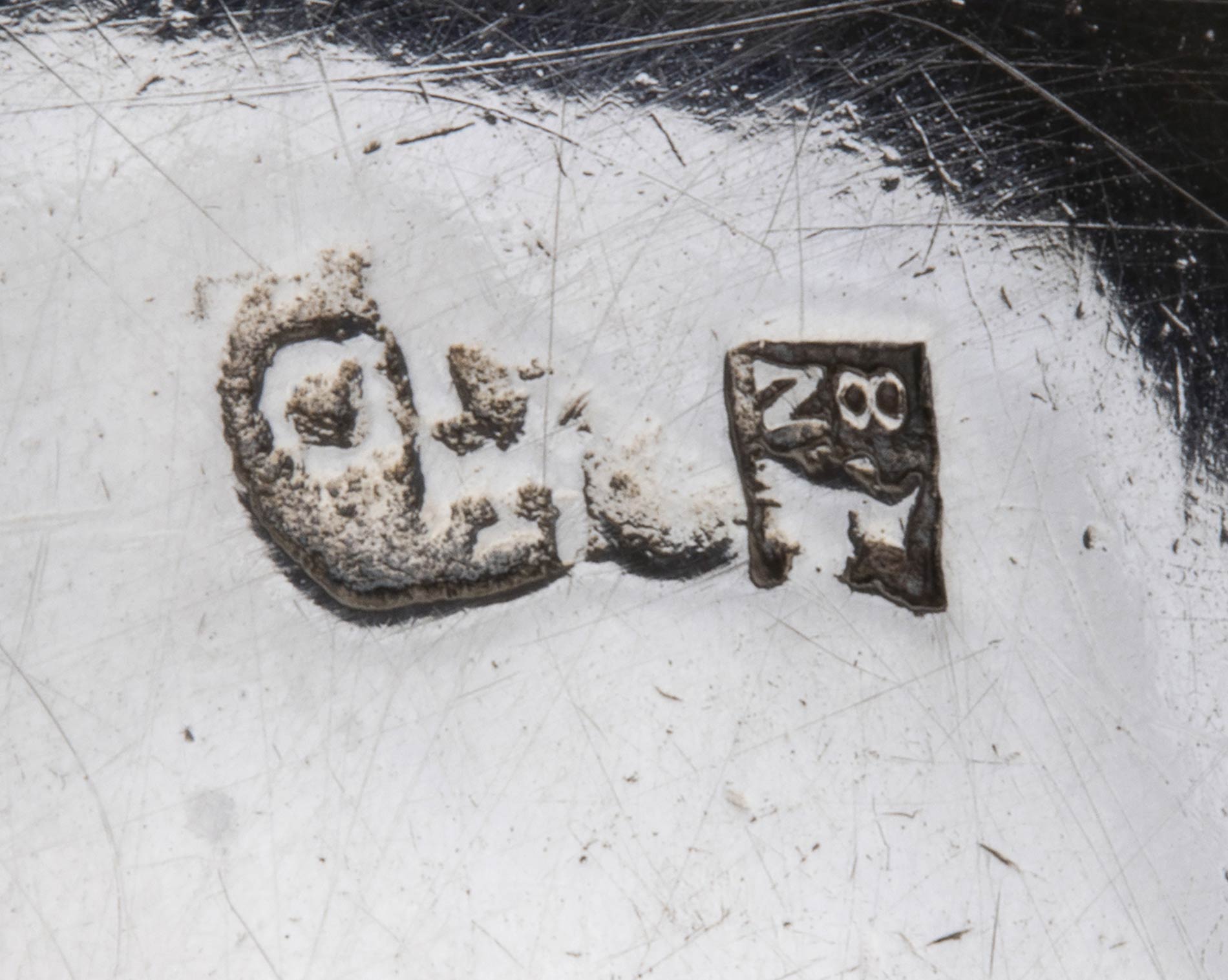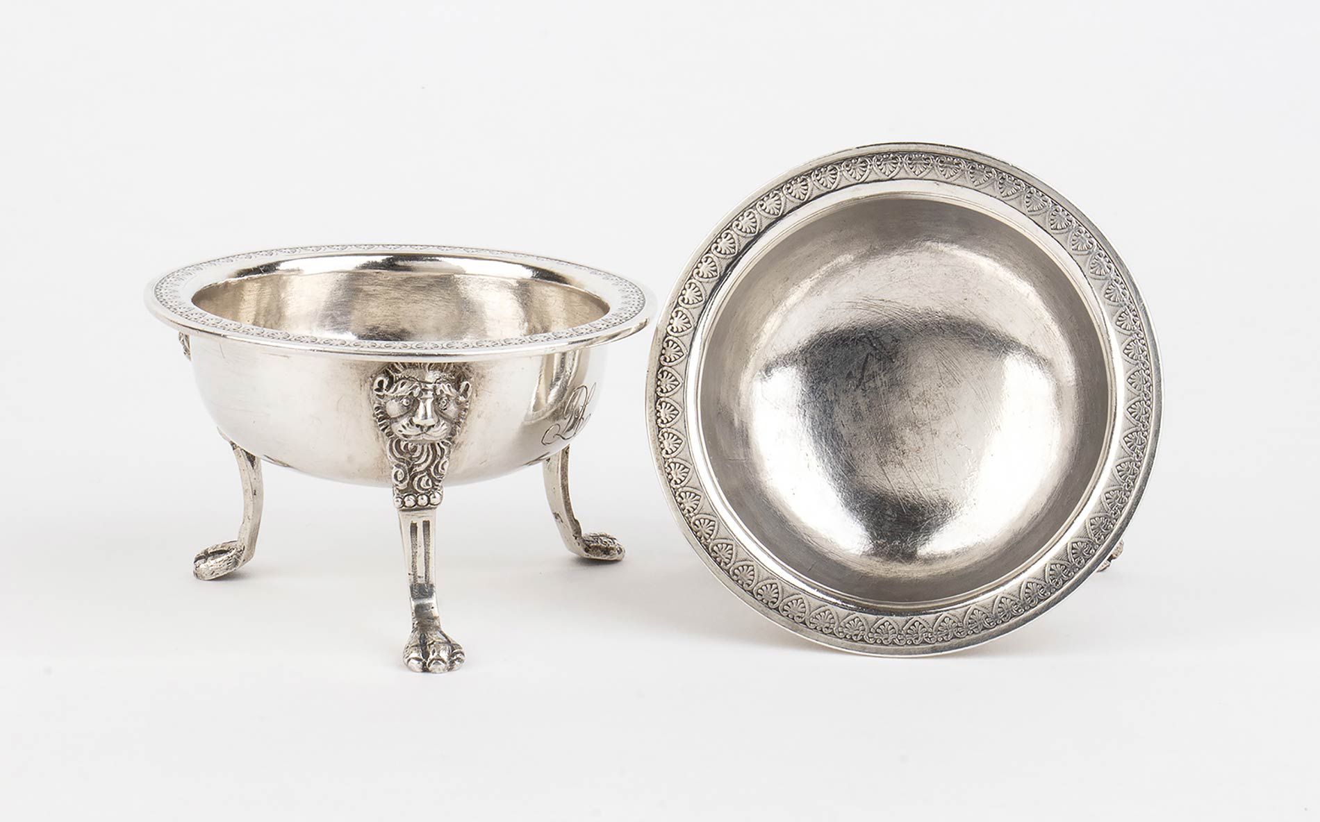 corpo circolare poggiante su tre piedi ferini. Serie completa di marchi per Napoli 1832-1872. Diametro 7,5 cm, altezza 5 cm. Peso complessivo 158 gr. Stato di conservazione: **** buono.