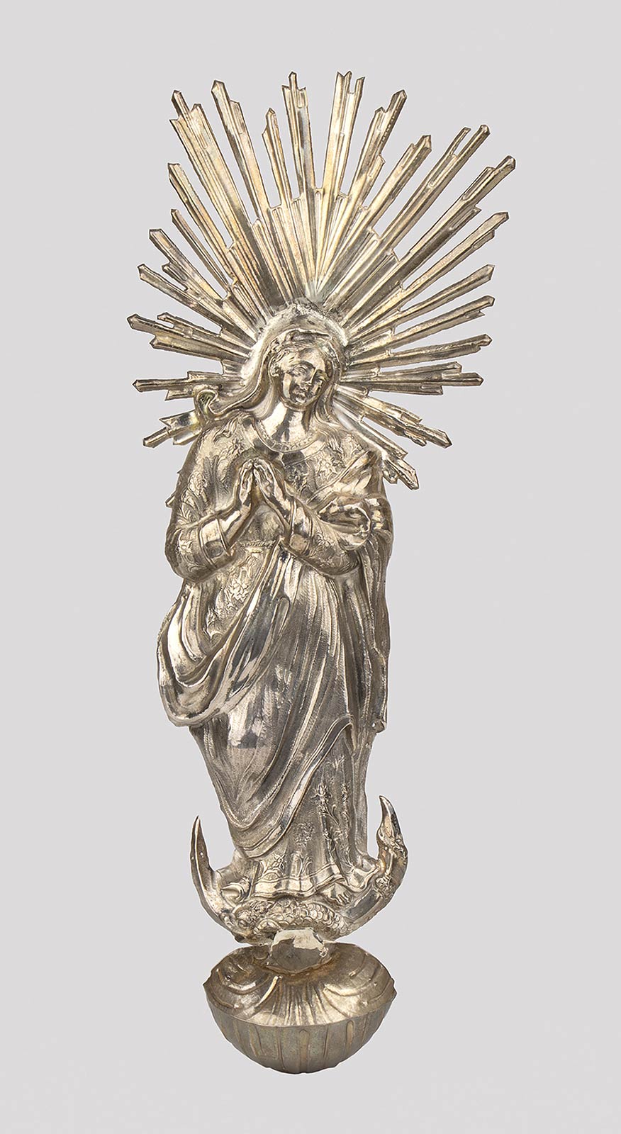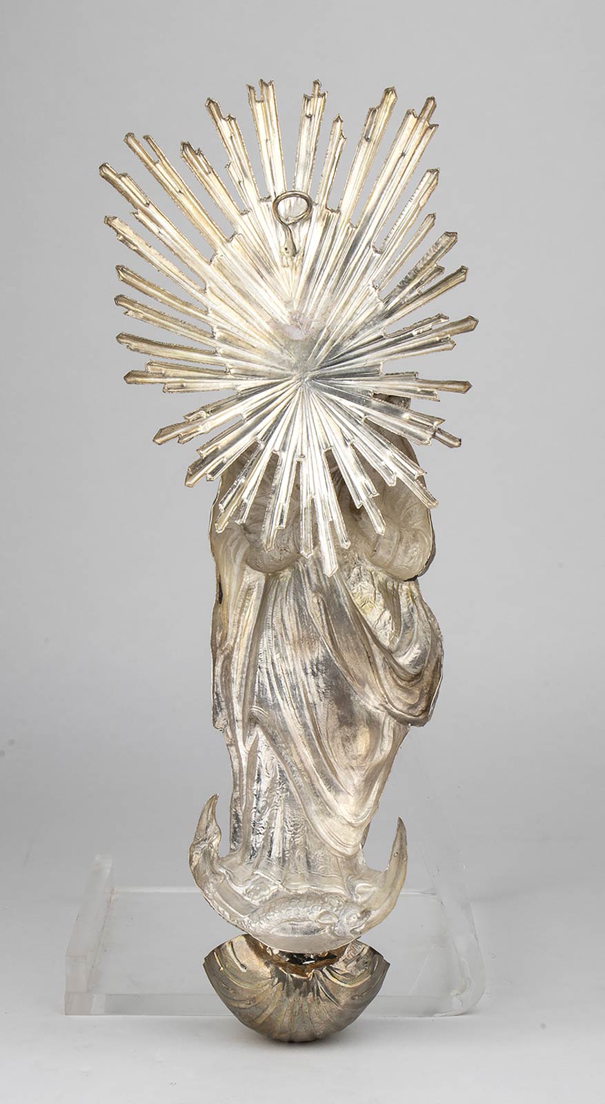 in argento sbalzato e cesellato con la raffigurazione della "Vergine Immacolata". Marchi non decifrabili. Altezza 34,5 cm, larghezza 13 cm. Peso 193 gr. Stato di conservazione: **** buono.