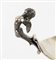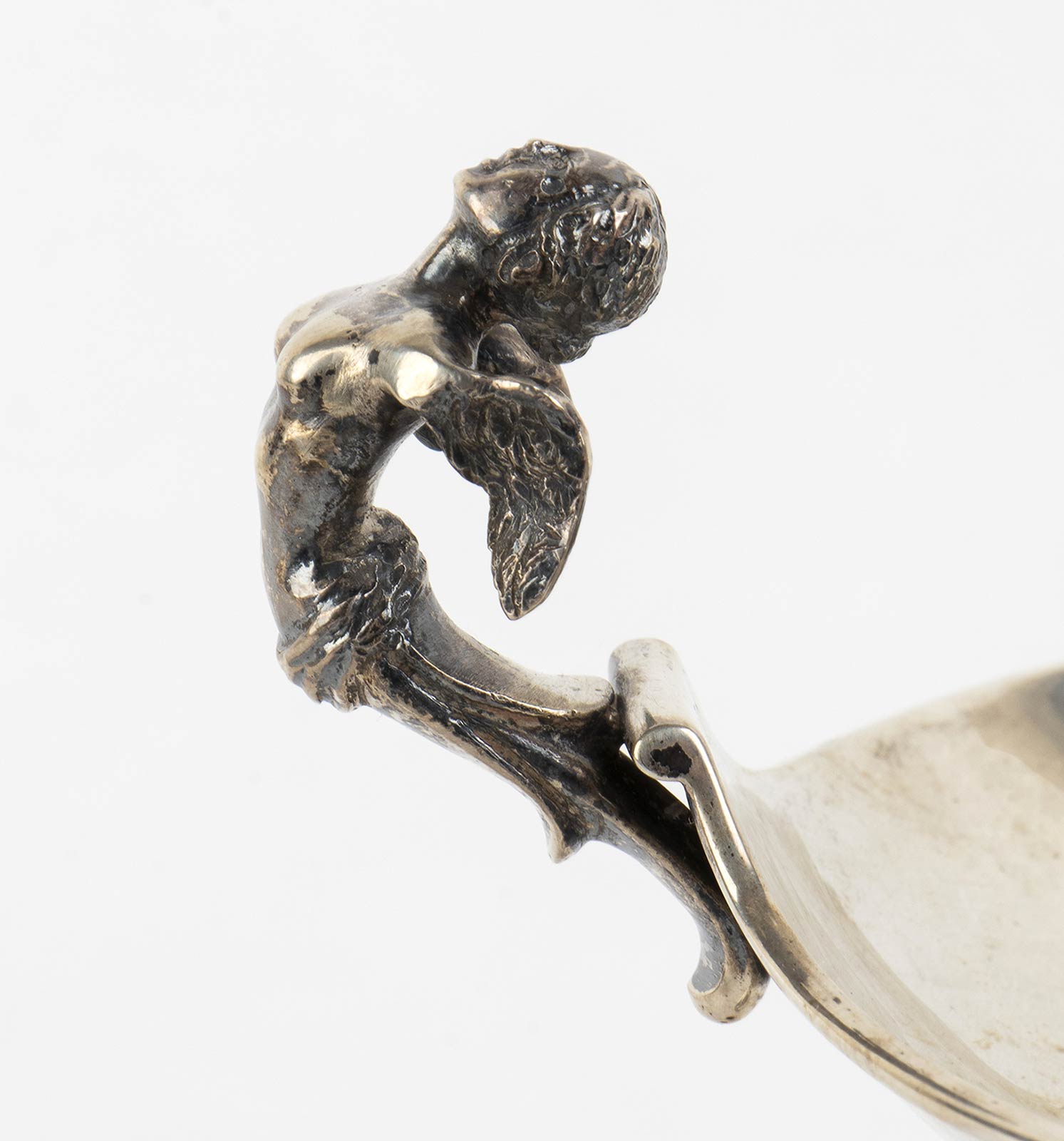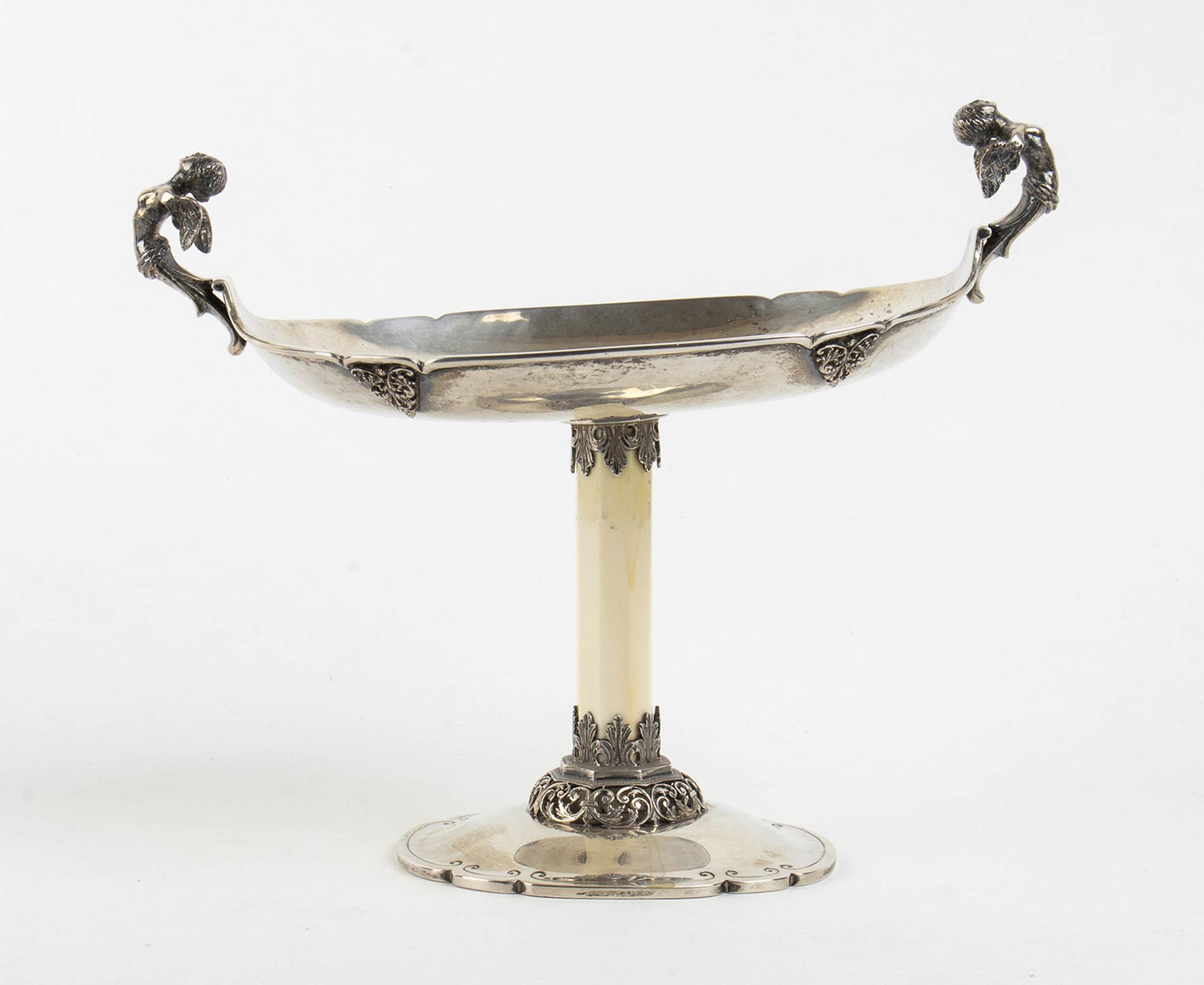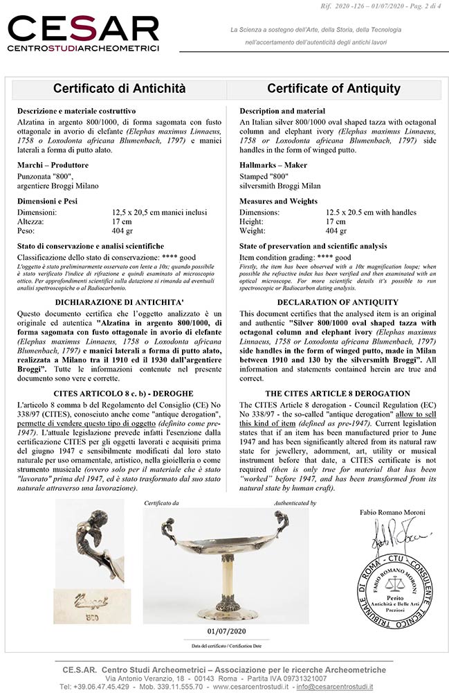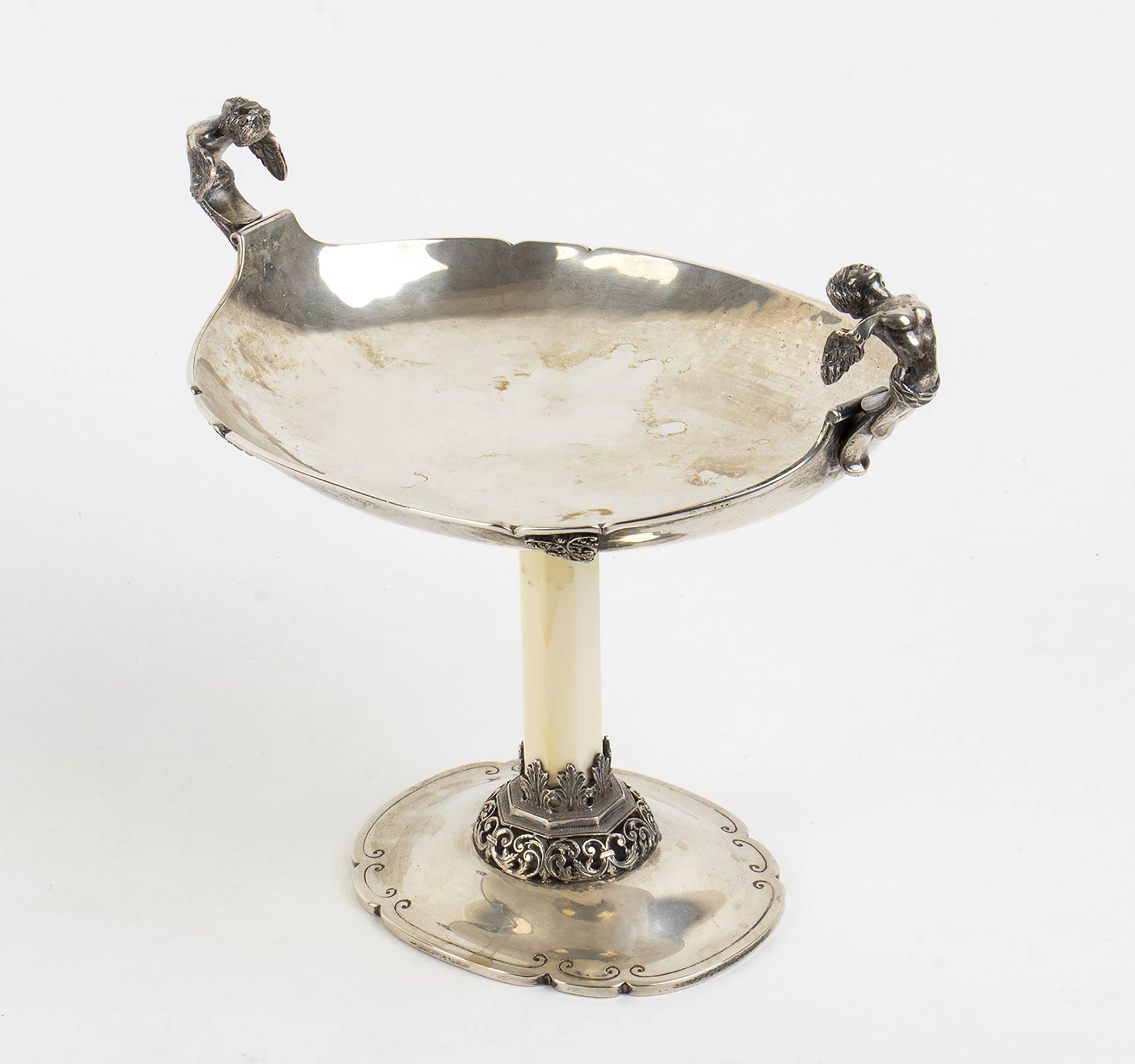 di forma sagomata con fusto ottagonale in avorio di elefante (Elephas maximus Linnaeus, 1758 o Loxodonta africana Blumenbach, 1797) e manici laterali a forma di putto alato. Punzonata "800", argentiere Broggi Milano. Dimensioni 12,5 x 20,5 cm manici inclusi, altezza 17 cm. Peso 404 gr. Stato di conservazione: **** buono. Certificato di Antichità Ce.S.Ar. (pre-1947).