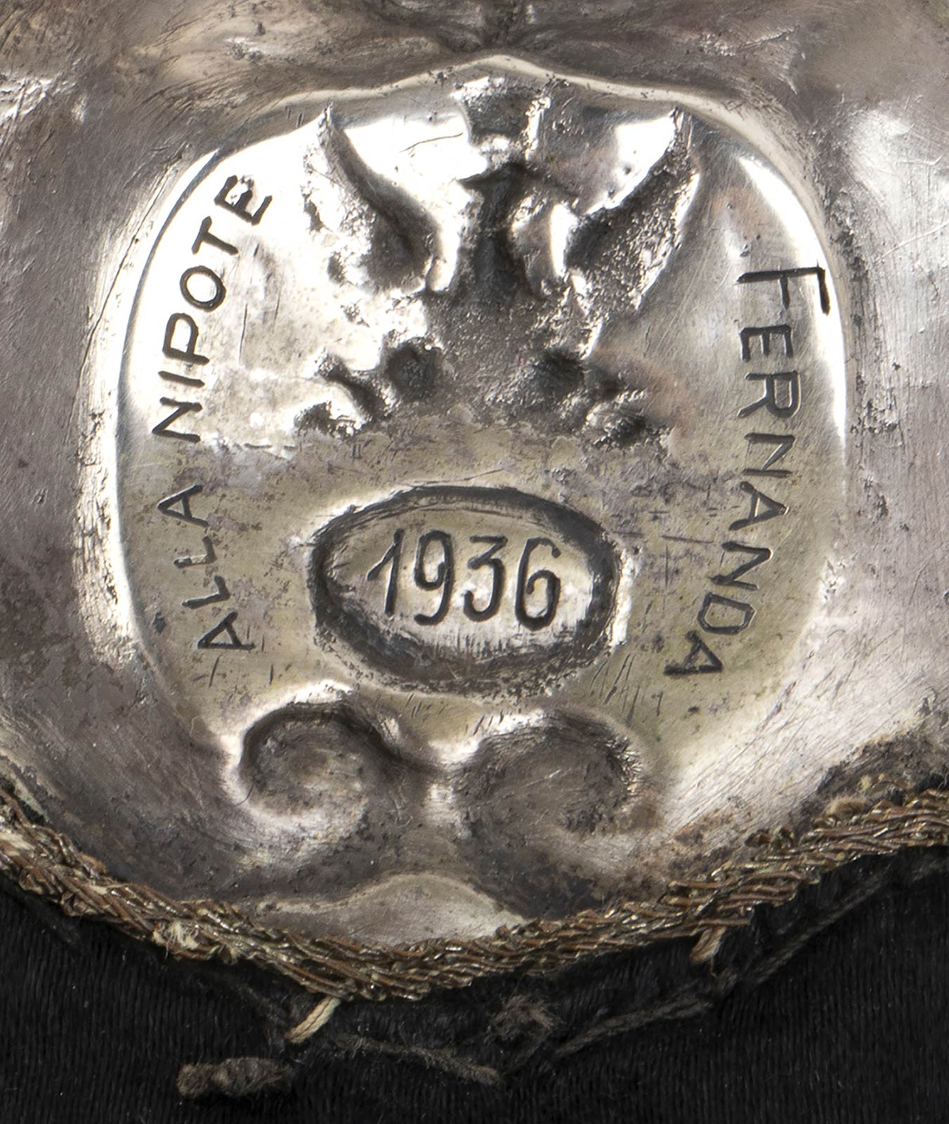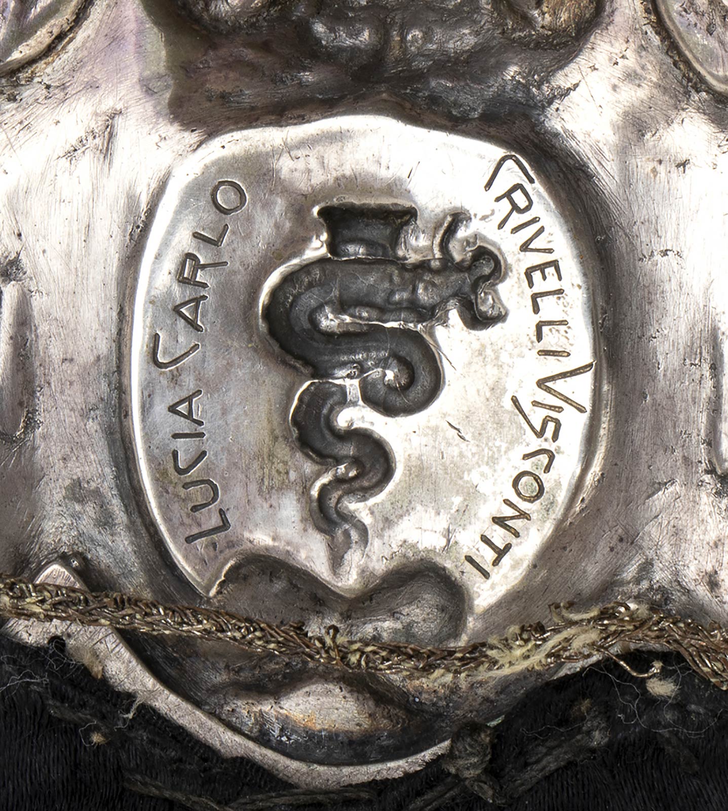 in seta nera con manico in argento fuso decorato con due coppie di putti, donata nel 1936 da Lucia (1911-2001) e Carlo Crivelli Visconti alla nipote Fernanda, come attestano le dediche incise all'interno del manico; sui lati esterni del medesimo sono inoltre presenti lo stemma nobiliare dei Visconti "d'argento, alla biscia d'azzurro, divorante un bambino nudo di carnagione e coronata d'oro" e quello dei Crivelli "di azzurro alla fascia d’oro accomp. in capo da un’aquila al naturale spiegata e coronata e in punta da un crivello d’oro". Dimensioni 25 x 30 cm. Peso 536 gr. Stato di conservazione: **** buono (piccolo difetti).