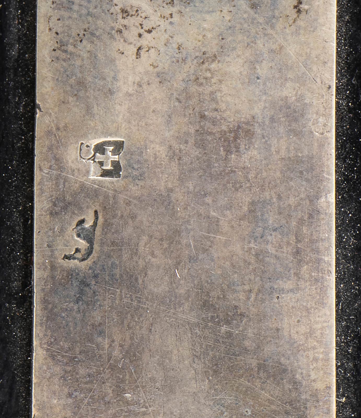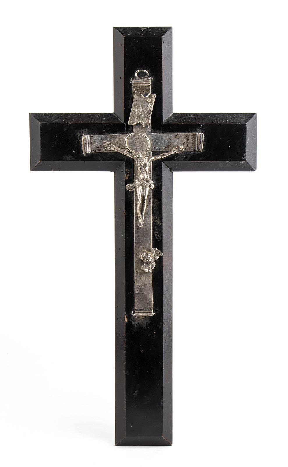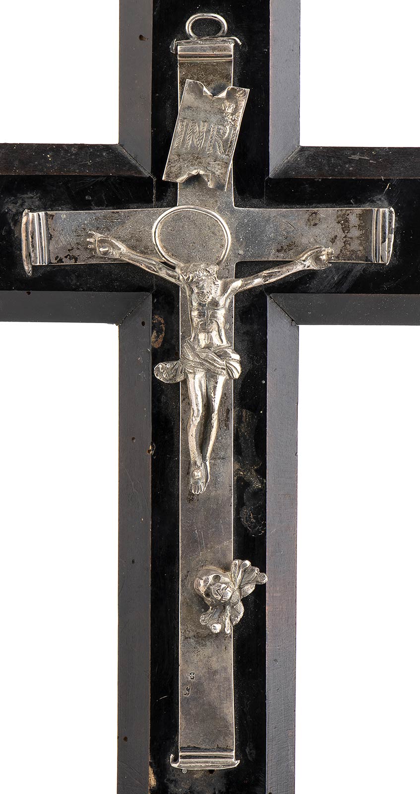 in argento fuso con croce lignea. Serie completa di marchi per Napoli 1839-1872, con apposito bollo per gli oggetti sacri dedicati al culto. Dimensioni 46 x 21,5 cm. Peso 339 gr. Stato di conservazione: **** buono.