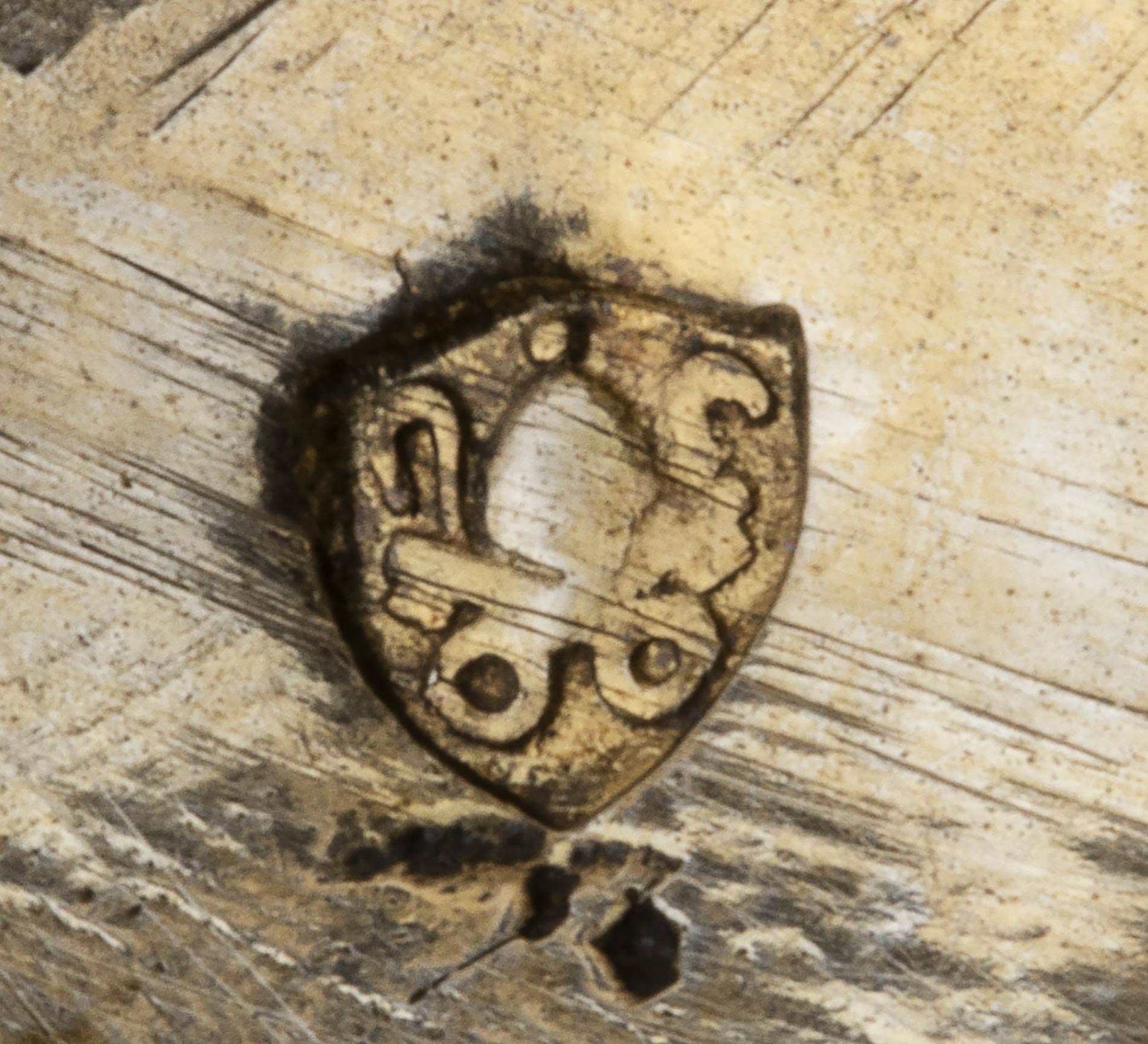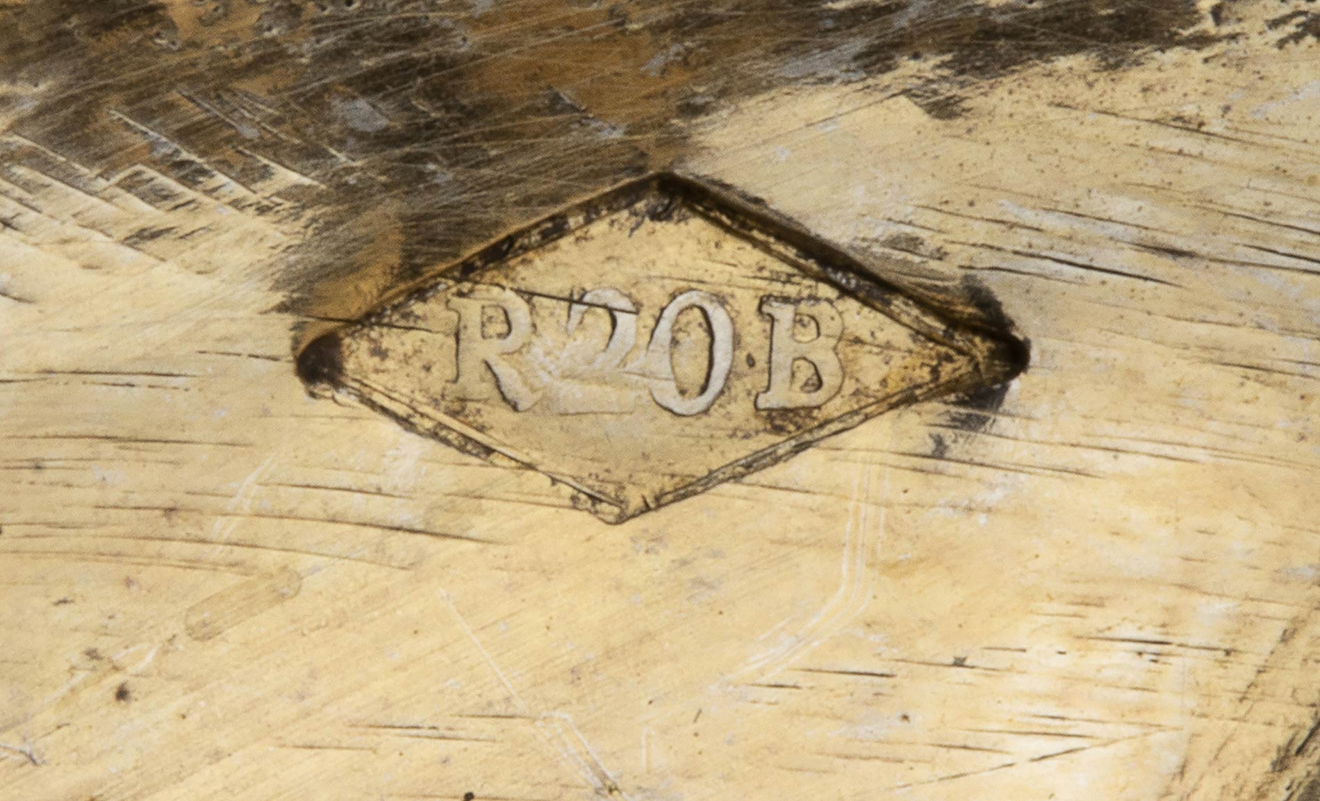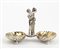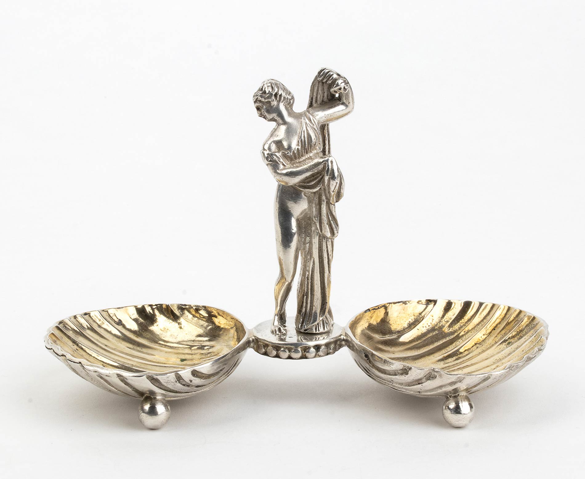 a due vasche poggianti su piedi a sfera con presa centrale a foggia di figura femminile. Punzonata con i marchi in uso a Roma dopo il 1815 per l'argento al titolo a 10 once e 16 denari (889/1000) e con il marchio dell'argentiere Bisori Raniero operante tra il 1824 ed il 1843. Dimensioni 15,5 x 7,5 cm, altezza 10 cm. Peso 295 gr. Stato di conservazione: **** buono.