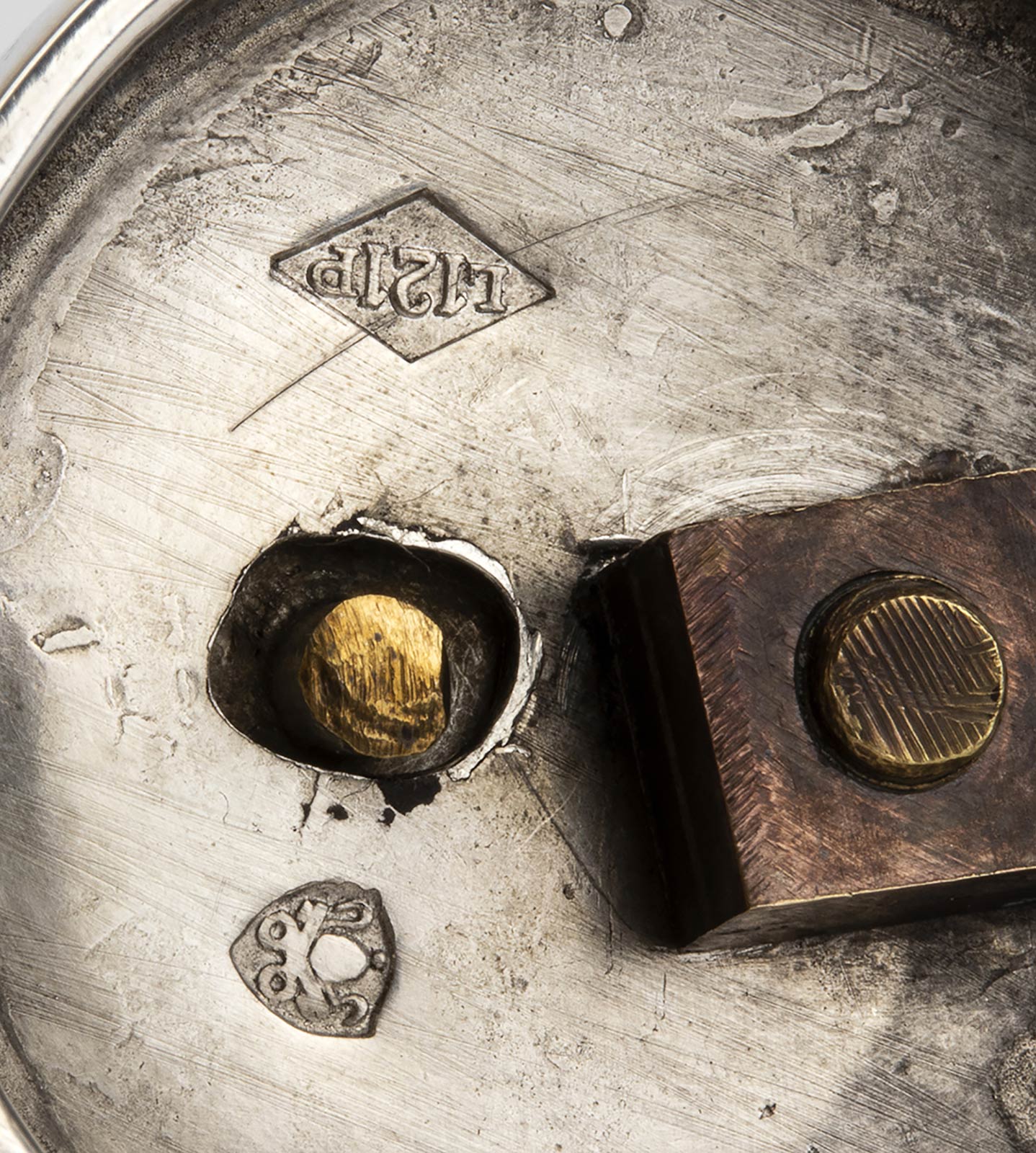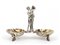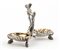 a due vasche poggianti su piedi a sfera con presa centrale a foggia di figura femminile. Punzonata con i marchi in uso a Roma dopo il 1815 per l'argento al titolo a 10 once e 16 denari (889/1000) e con il marchio dell'argentiere Pagliari Luigi operante tra il 1828 ed il 1841. Dimensioni 15,5 x 7,5 cm, altezza 11 cm. Peso 340 gr. Stato di conservazione: **** buono.
