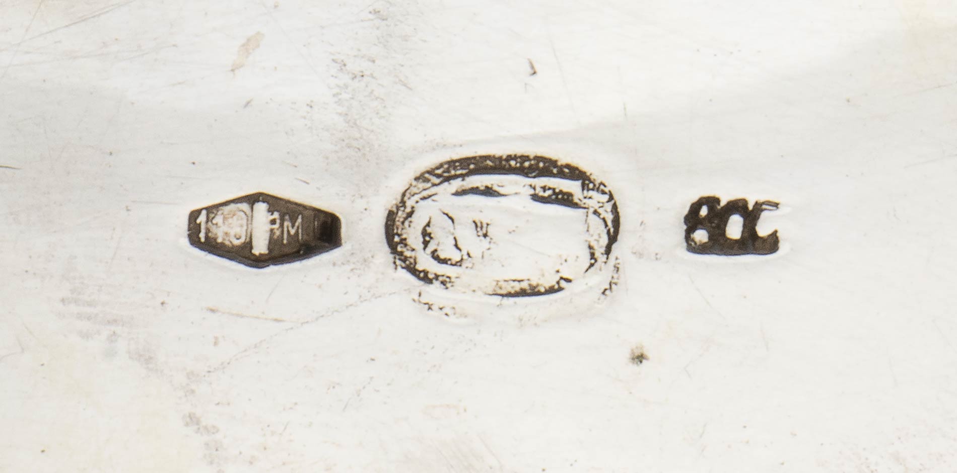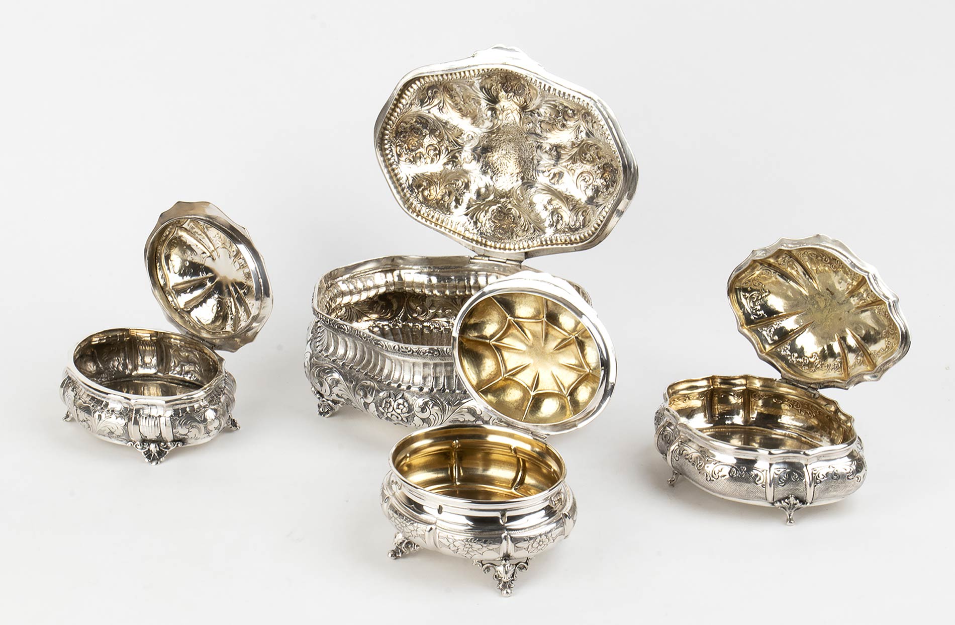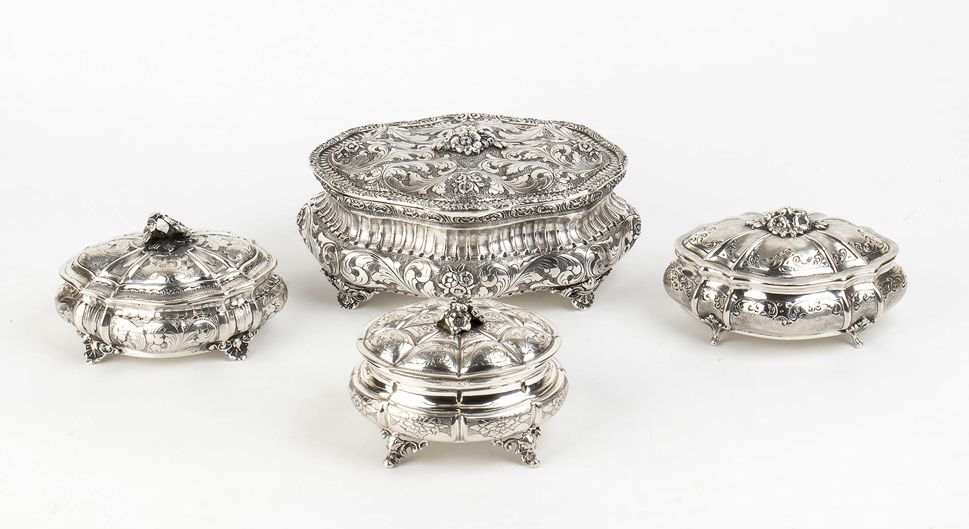 la piu grande punzonata "800" e con il marchio di epoca fascista "110MI", argentiere Ganci di Milano; Dimensioni 19 x 14 x 8,5 cm, peso 558 gr. La seconda punzonata "800" e con il marchio di epoca fascista "47MI", argentiere Ditta Torchiana e Loda di Milano; Dimensioni 12,5 x 9 x 6 cm, peso 202 gr. La terza punzonata "800" e con il marchio "AB" di un argentiere non identificato, prodotta prima del 1935; Dimensioni 12,5 x 9 x 6,5 cm, peso 228 gr. La quarta punzonata "800" e con il marchio di un argentiere non identificato, prodotta prima del 1935; Dimensioni 12,5 x 9 x 6,5 cm. Peso 228 gr. Stato di conservazione: ***** ottimo.