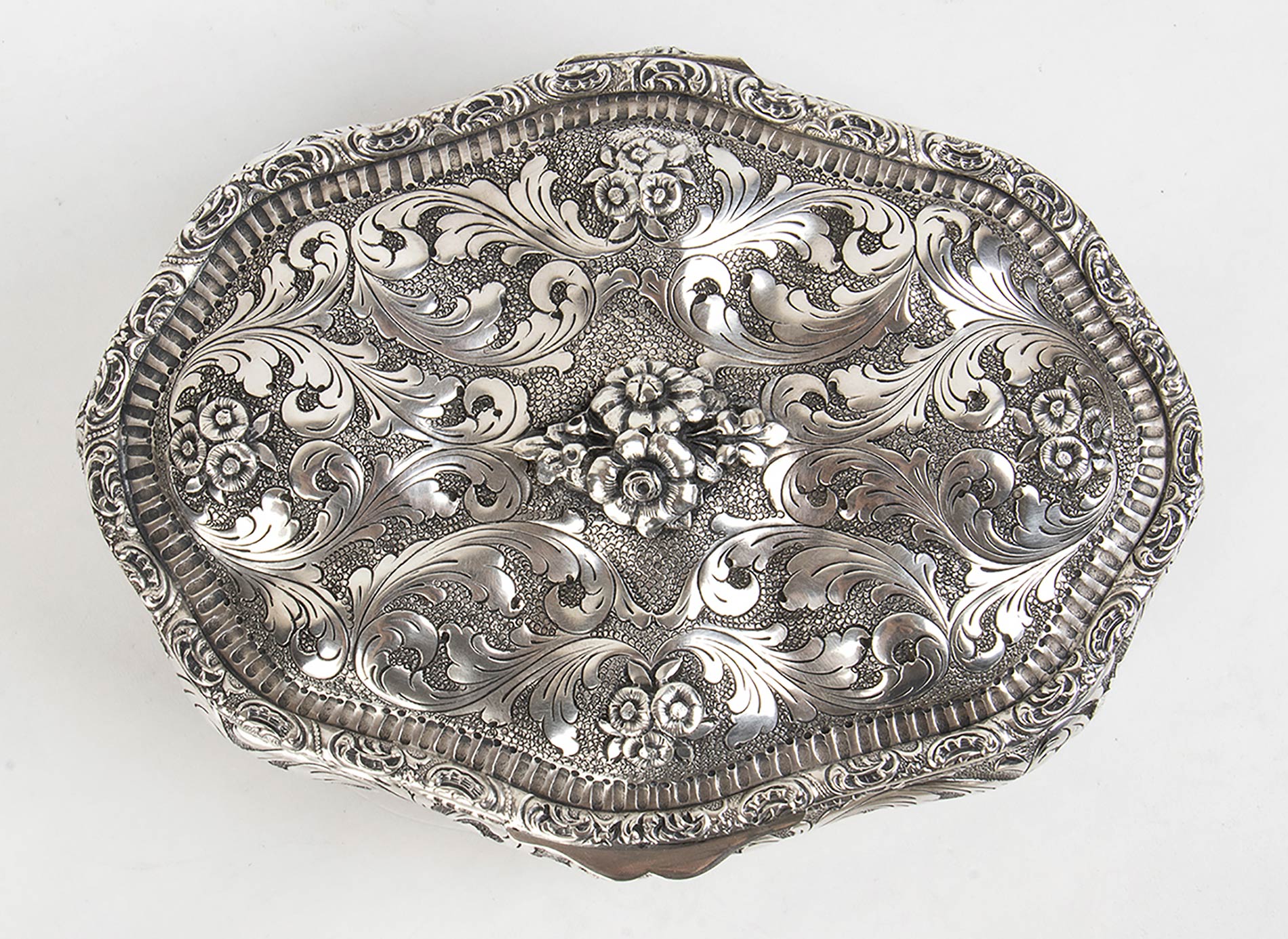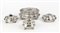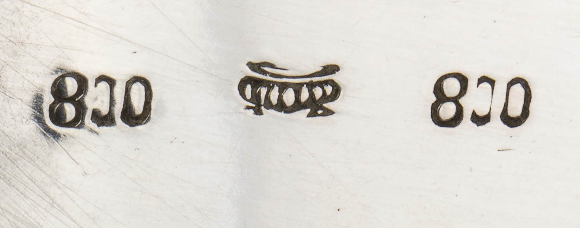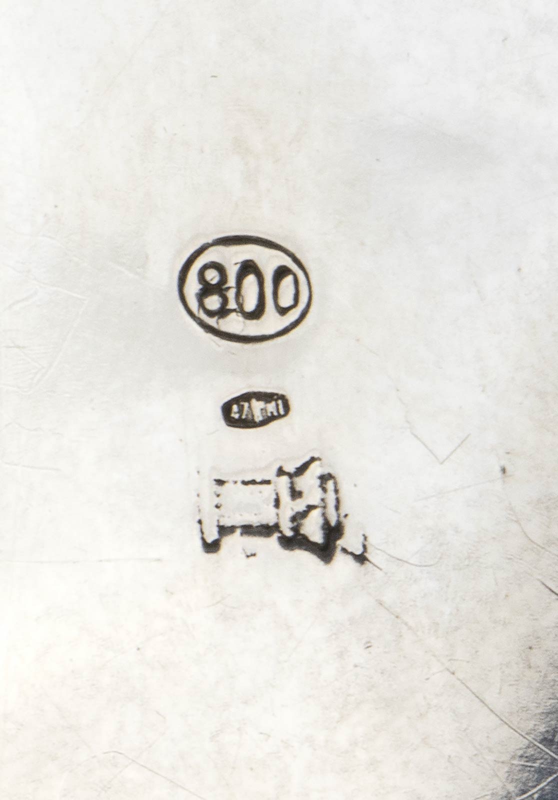 la piu grande punzonata "800" e con il marchio di epoca fascista "110MI", argentiere Ganci di Milano; Dimensioni 19 x 14 x 8,5 cm, peso 558 gr. La seconda punzonata "800" e con il marchio di epoca fascista "47MI", argentiere Ditta Torchiana e Loda di Milano; Dimensioni 12,5 x 9 x 6 cm, peso 202 gr. La terza punzonata "800" e con il marchio "AB" di un argentiere non identificato, prodotta prima del 1935; Dimensioni 12,5 x 9 x 6,5 cm, peso 228 gr. La quarta punzonata "800" e con il marchio di un argentiere non identificato, prodotta prima del 1935; Dimensioni 12,5 x 9 x 6,5 cm. Peso 228 gr. Stato di conservazione: ***** ottimo.