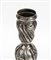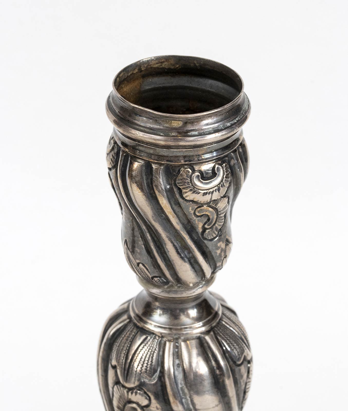 di linea Luigi XV con alta base mistilinea a decori floreali e nervature verticali ad andamento tortile che partendo dalla base sagomata proseguono lungo il fusto a balaustro. Punzonati con il marchio della "Torretta" in uso alla corporazione degli Orefici di Genova e del sottostante millesimo che, se pur consunto, ci autorizza a datarli al 1777 ((Rif. argenti genovesi la Torretta di G.Roccatagliata, ed. Tormena, Genova 1992) . Diametro base 14,5 cm, altezza 27,2 cm. Peso 760 gr. Stato di conservazione: **** buono.