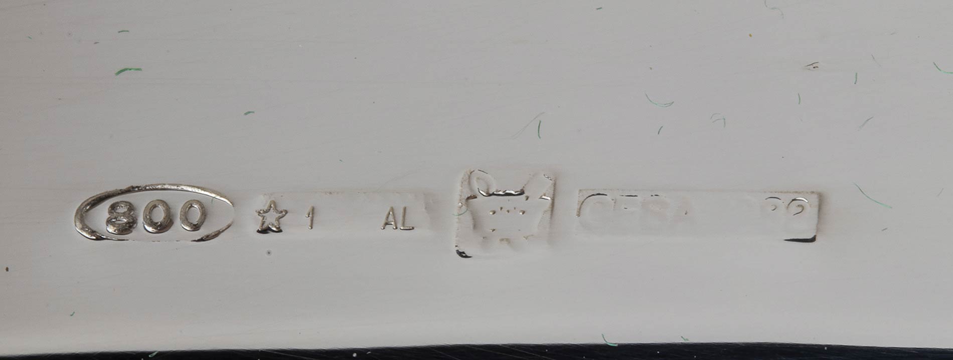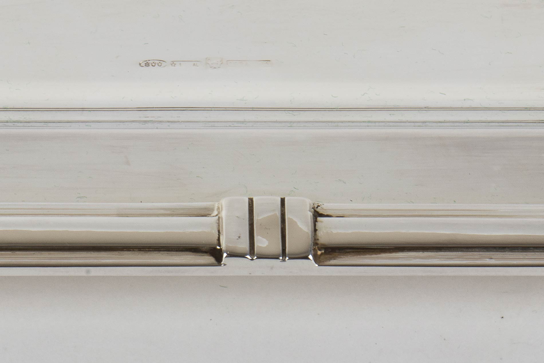 di forma rettangolare con manici in legno. Punzonati "800", argentiere CESA 1882. Dimensioni 36,5 x 62 cm manici inclusi. Peso 2323 + 2259 gr. Stato di conservazione: ***** nuovi. Scatola originale.